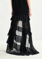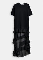 Knitted dress is shaped to a relaxed T-shirt silhouette with a round neckline and short sleeves. It falls into a straight fit through the body before transitioning into a sheer hem defined by cascading tiered ruffles. The contrast of textures adds depth and movement to the minimalist shape.