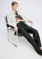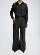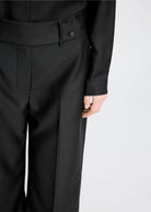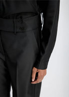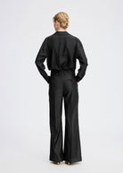 Elegant trousers with wide legs and fine pressed pleats. These trousers are designed with belt loops, pockets, and a beautiful button fastening at the waist. They can be styled with the Rillo Jacket for a complete and stylish suit.