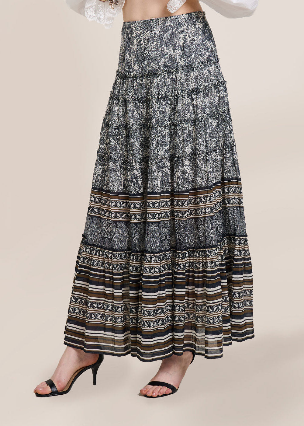 captures effortless style and comfort. Crafted from a blend of viscose and cotton suchi voile, this maxi-length skirt features an engineered placement print all over creating a striking visual effect.