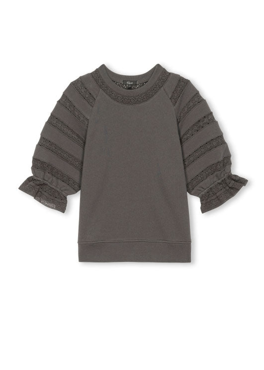 The Aggy is a luxe French terry sweatshirt with a relaxed, comfortable fit. Inset cotton lace and ruffled sleeves lend a soft, feminine touch.