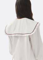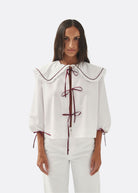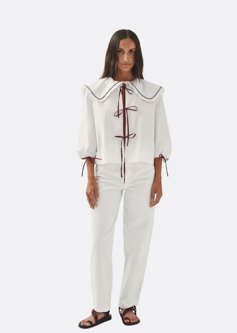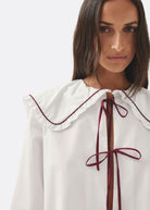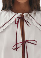White blouse with babydoll collar and burgundy tie details.