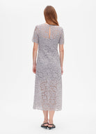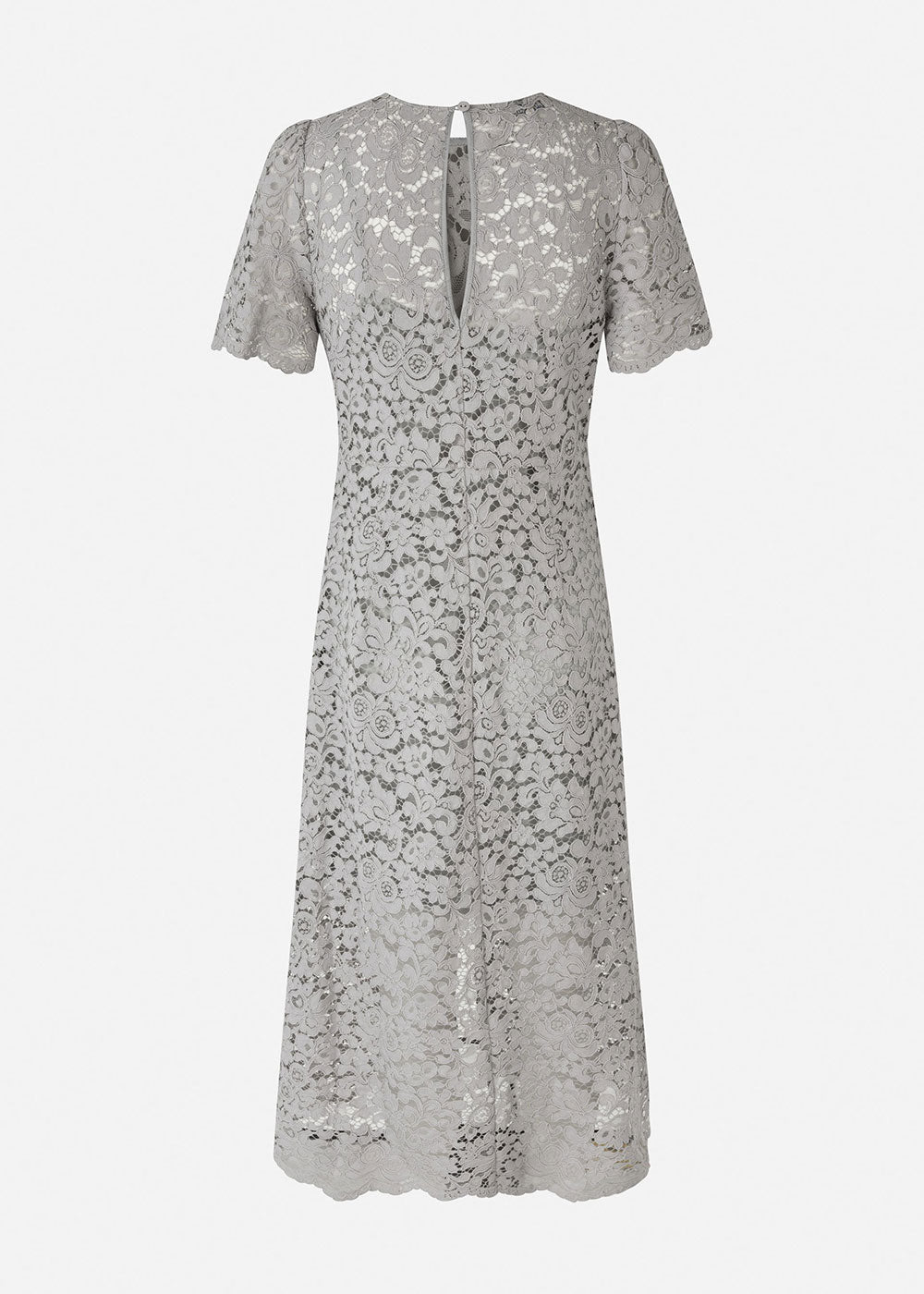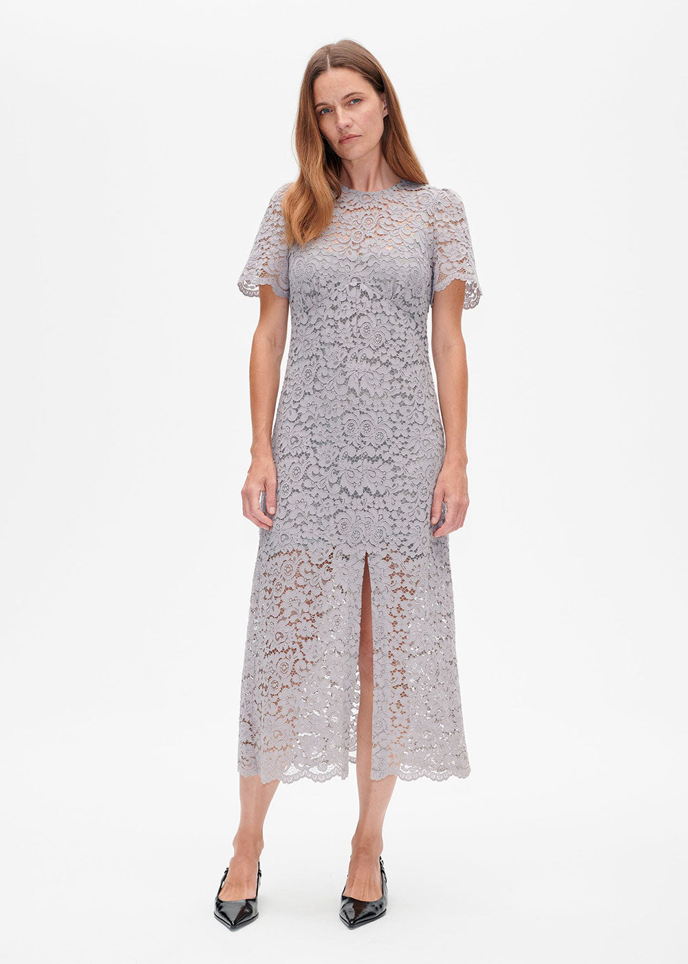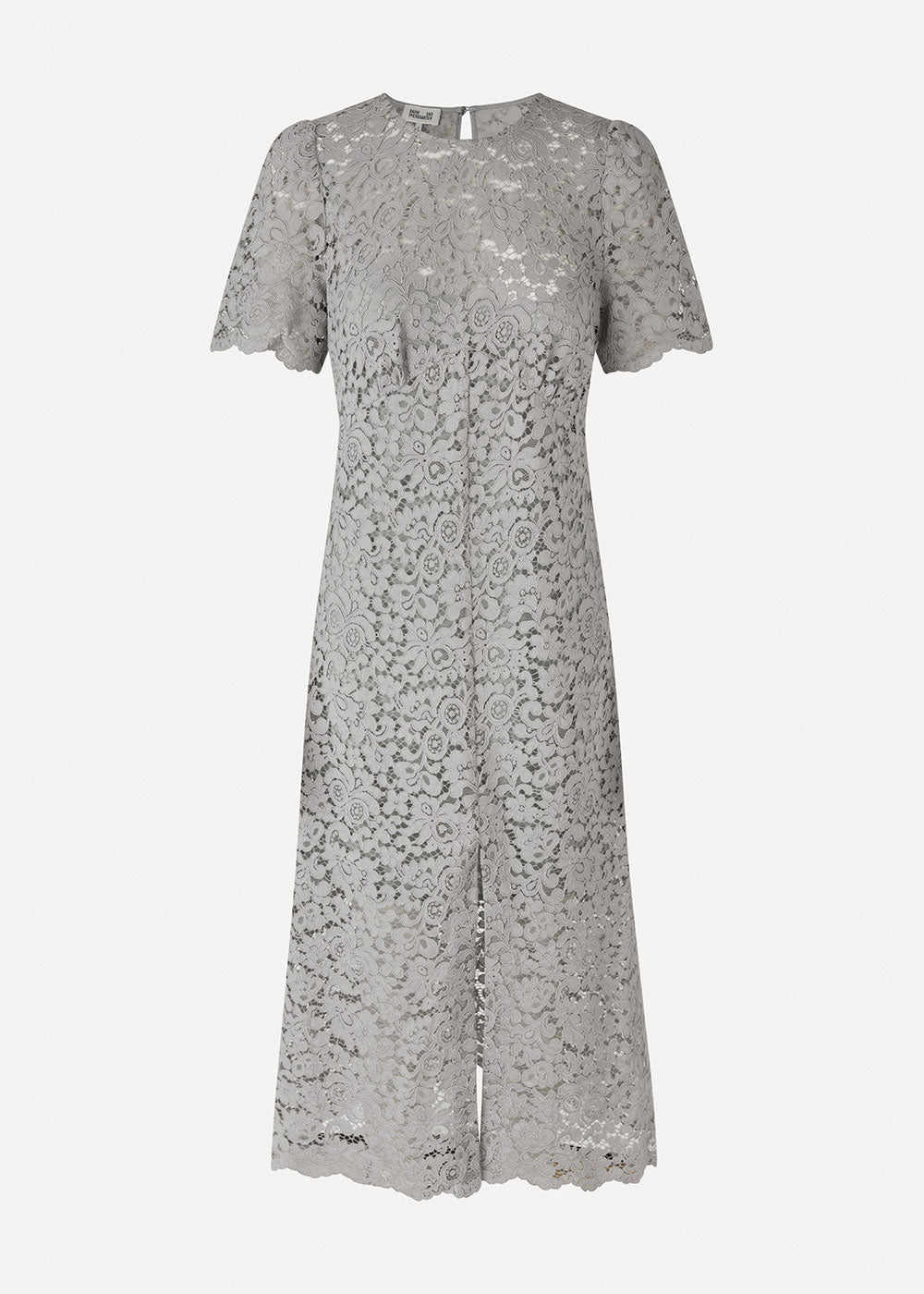 The Avigail Dress is a midi-length lace dress that embodies elegance with a modern twist. Its intricate lace design is complemented by a front slit for added sophistication and ease of movement. Featuring a scalloped hem and short sleeves, this dress offers a feminine and refined silhouette. The semi-sheer finish gives it a light, airy feel, making it perfect for special occasions or elevated daytime looks.