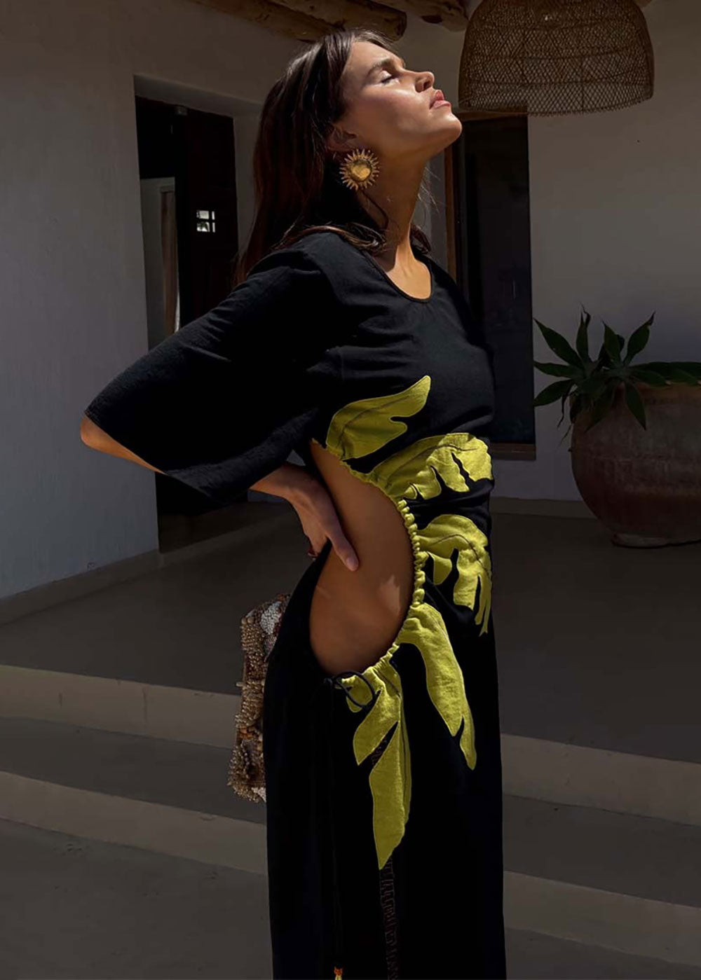 This dress is bring all the feel good vibes! A lightweight, cotton blend maxi dress suitable for dressing up or down. With our iconic palm motif accompanied by cut out detailing on the waist that can be adjusted to suit everybody! The relaxed silhouette makes this an definite holiday essential, whether it's thrown over swimwear for an easy day out or paired with heels and a clutch for a casual night out look.