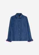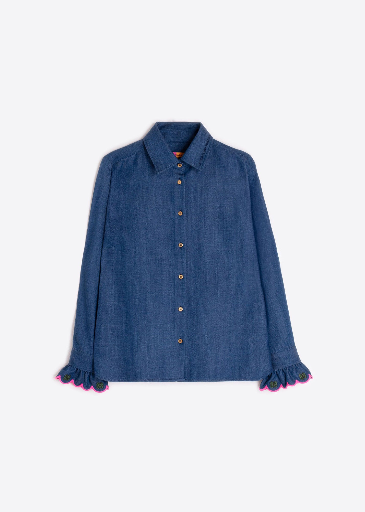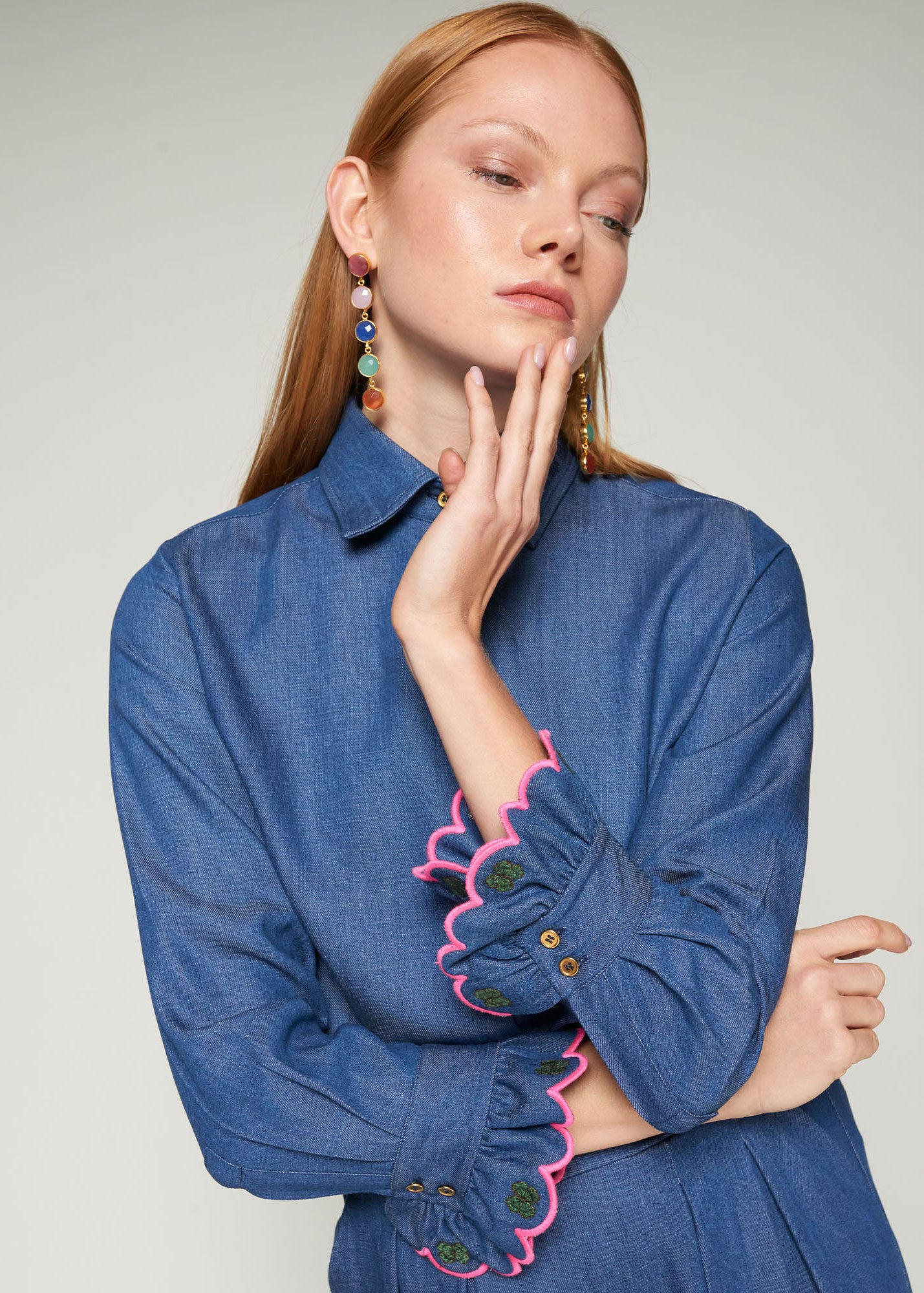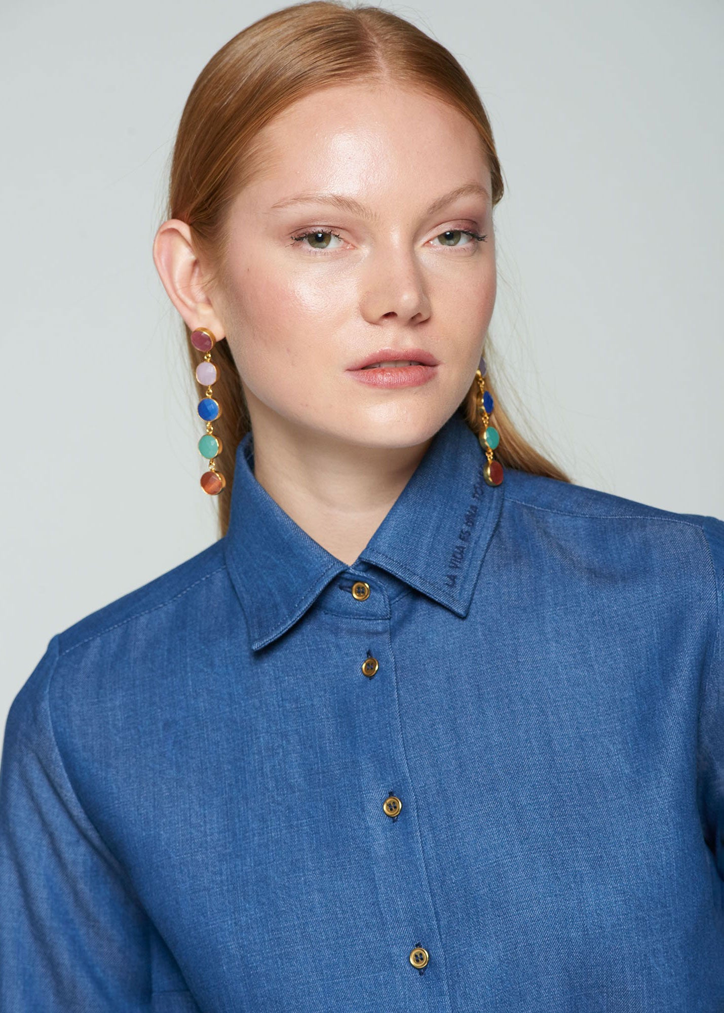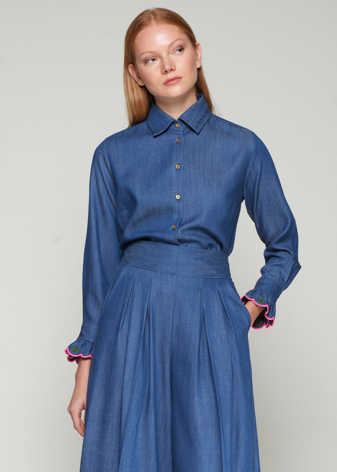 Straight-cut denim shirt in deep blue with classic collar and visible contrasting buttons. Cuffs are finished with green embroidery and a fluo pink scalloped edge. Subtle phrase “LA VIDA ES UNA FIESTA” embroidered on the collar. Lightly structured fabric, soft to the touch.