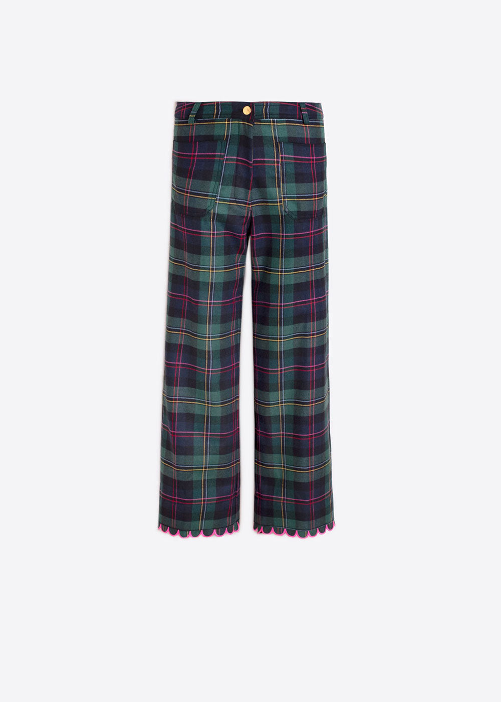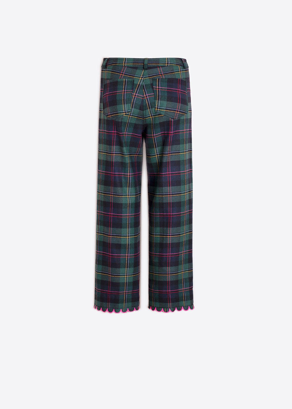Straight-leg trousers in a multicolour tartan check with green, navy and red tones. Finished with scalloped pink edging at the hem for a unique twist. Mid-rise waist with front zip and button closure. Ankle length, no visible pockets. Made from a cotton blend with contains wool for comfort and structure.