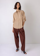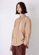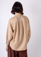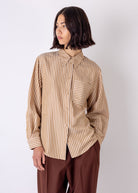 The EMBER shirt is made from soft fabric in a beige and sand stripe. A hardworking addition to any wardrobe, it works well tucked in or worn loose.