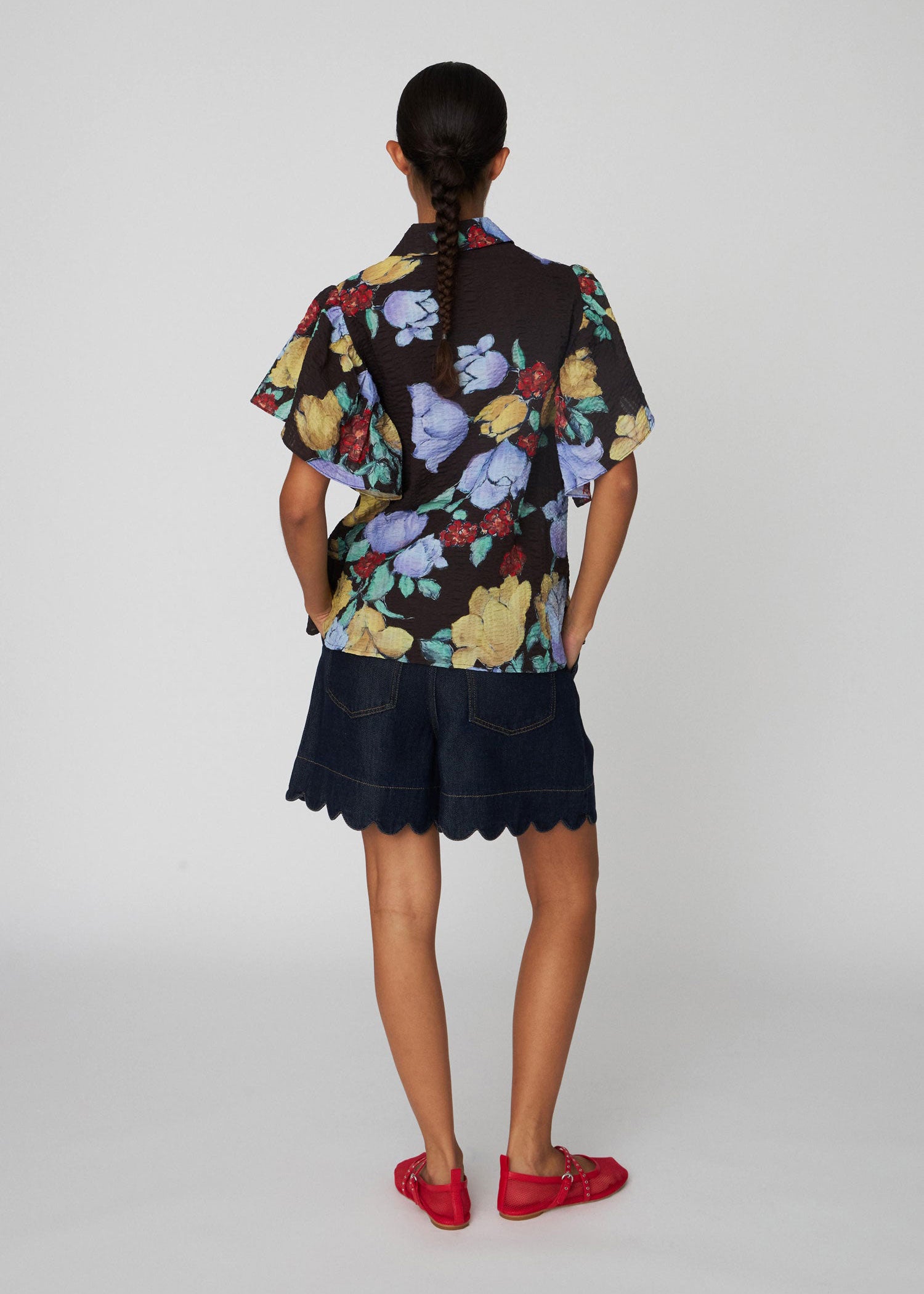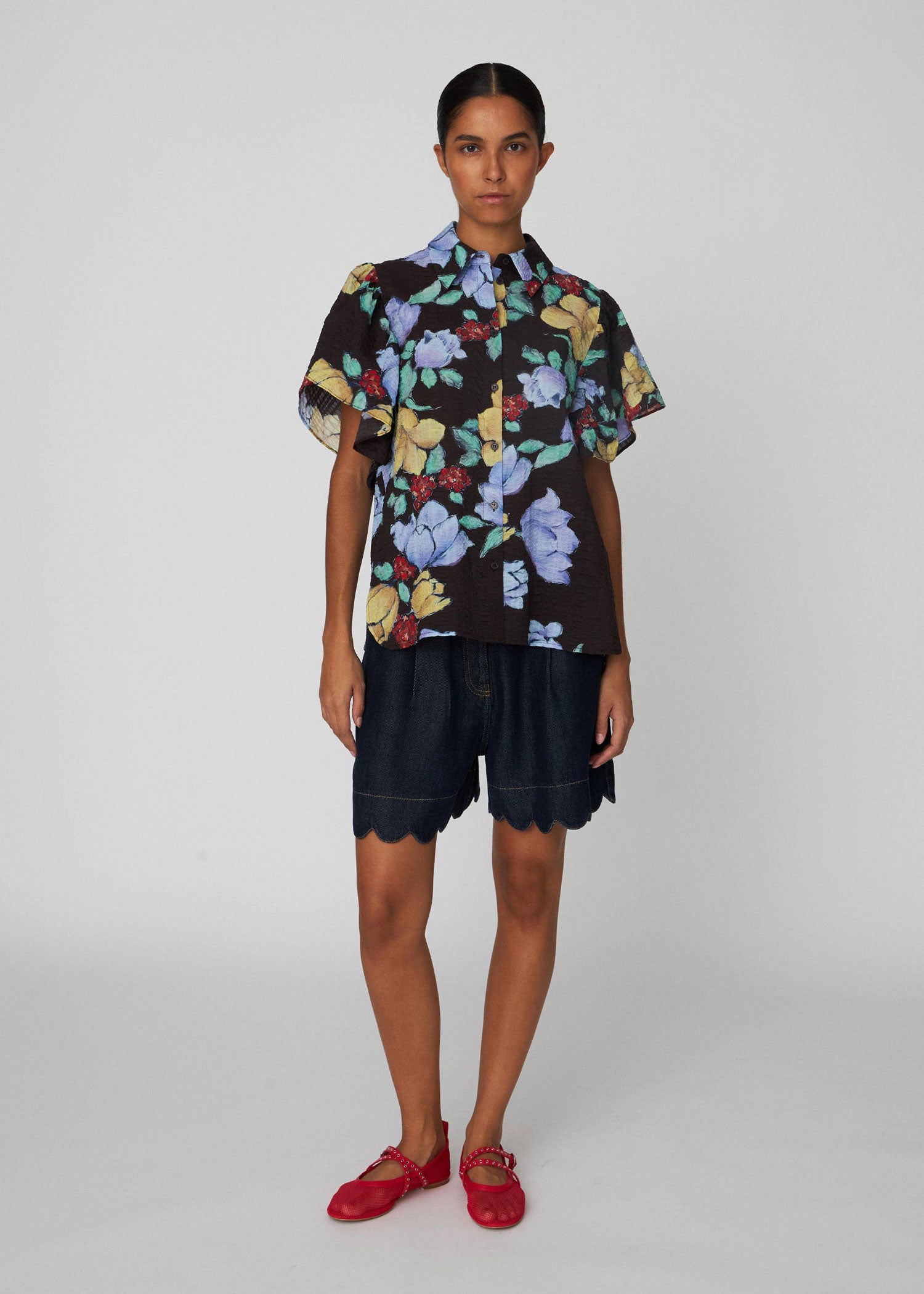 Short-sleeved shirt in a lightweight, textured fabric with a floral print, button closure, and a classic collar.