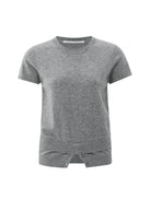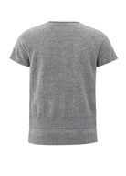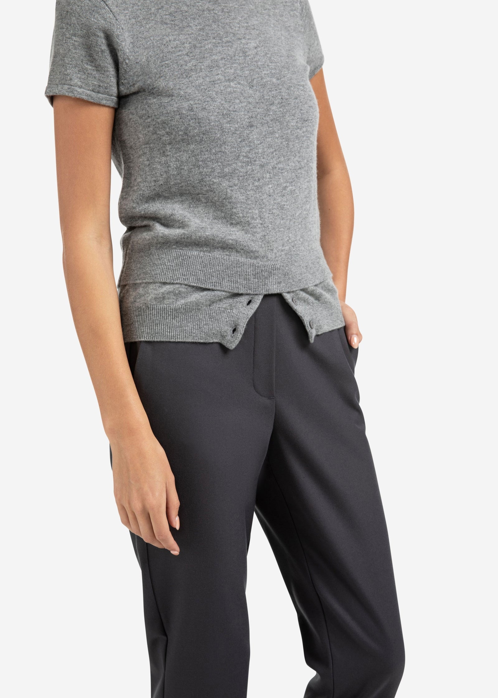 This finely knitted top features short sleeves, a crew neckline, and a loose fit. The layered hem with button details creates the illusion of a double layer, adding a playful and modern touch. Crafted from a soft, comfortable fabric. Perfect for a stylish and casual look. The model is 175 cm and wears size S.