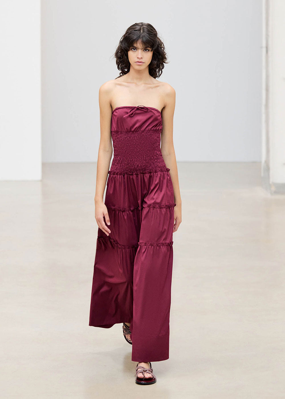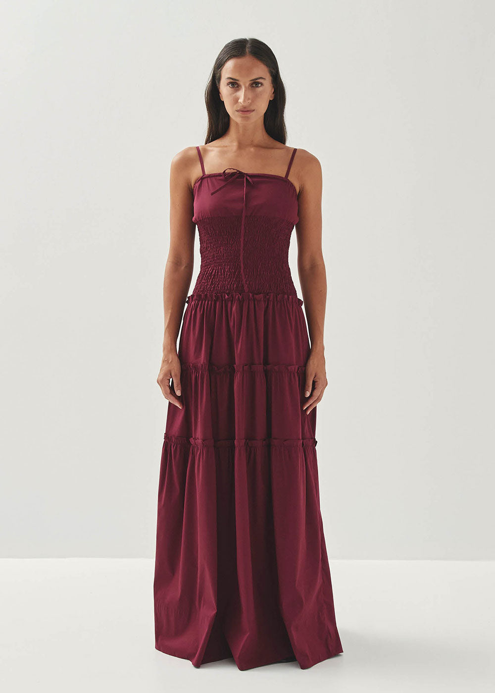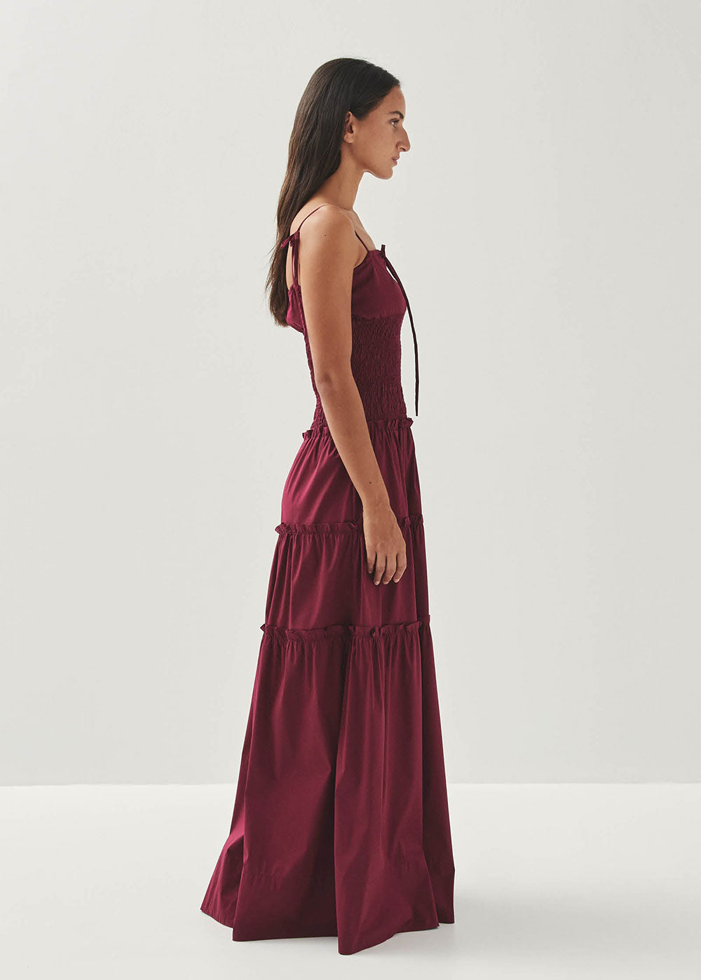 Burgundy maxi dress with smocked bodice and tiered skirt.