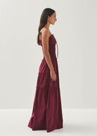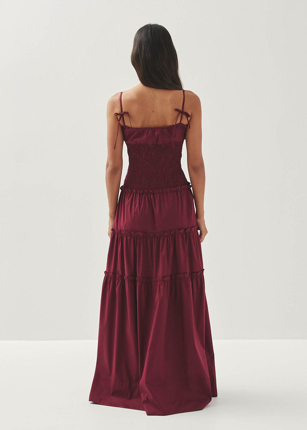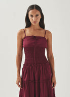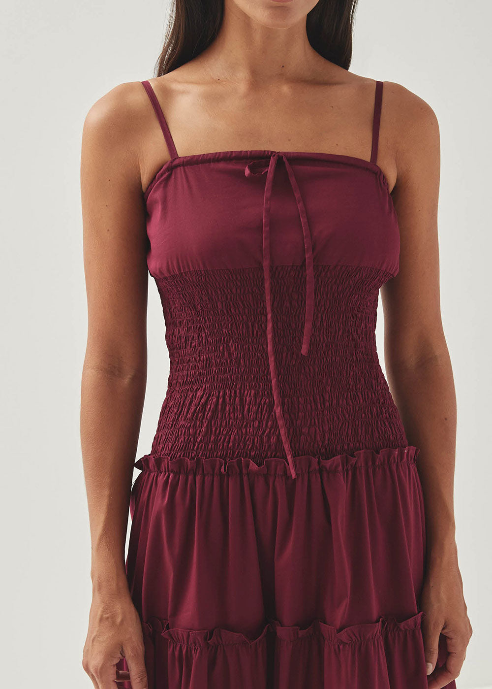 The Masami maxi dress features a straight neckline framed by a delicate adjustable tie. Its smocked bodice begins at the bust, offering a flattering fit before flowing into a tiered skirt. Designed in a deep burgundy hue, it is finished with thin straps that enhance its refined and graceful look.