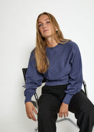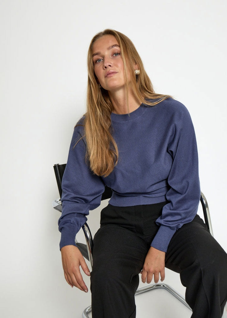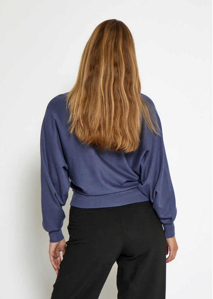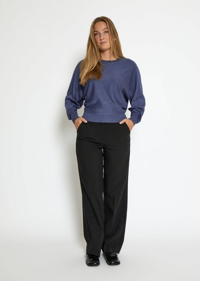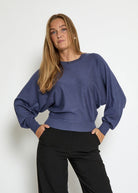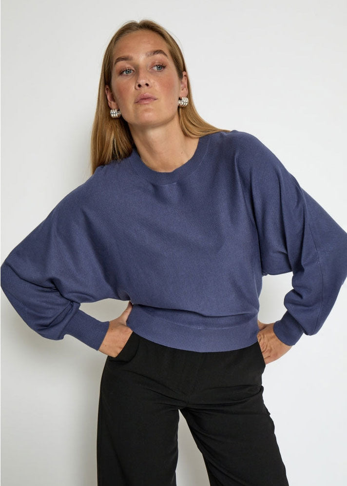Soft and relaxed knit sweater with a round neckline and long, slightly batwing sleeves. The model has wide ribbed edges at the bottom and at the wrists, which creates an elegant silhouette with a casual touch. The loose fit and soft quality make for a comfortable and stylish everyday classic.