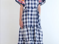 Cotton midi dress with ruffled sleeves, with navy blue and white gingham print. Square neckline and cut sleeves. Colourful embroidered details on the sleeves. Removable belt.