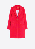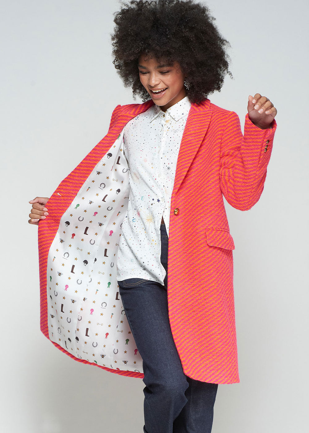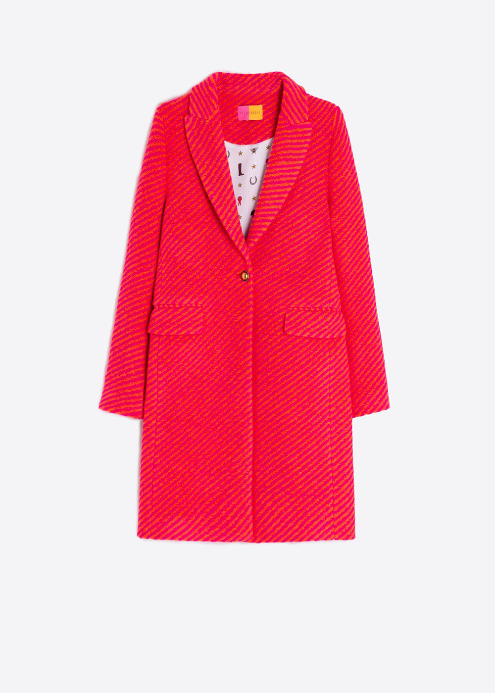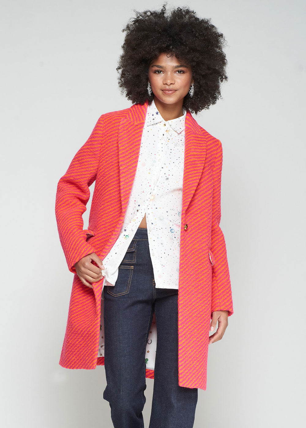 Long coat featuring a bold diagonal stripe pattern in vibrant pink and orange tones. Straight cut with a classic notched lapel collar and a single front closure with a gold-tone button. Side pockets with flaps and decorative gold buttons on the cuffs. Lined interior with printed motifs. Structured fabric in a blend of wool.