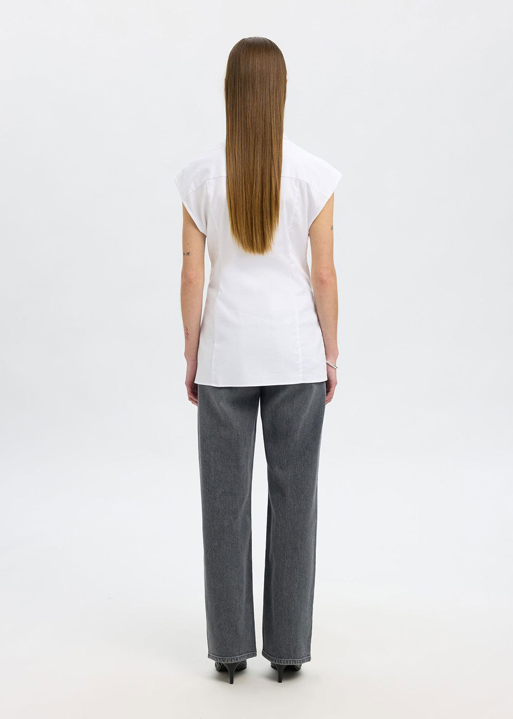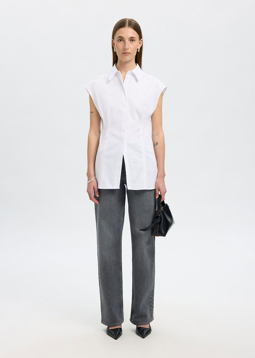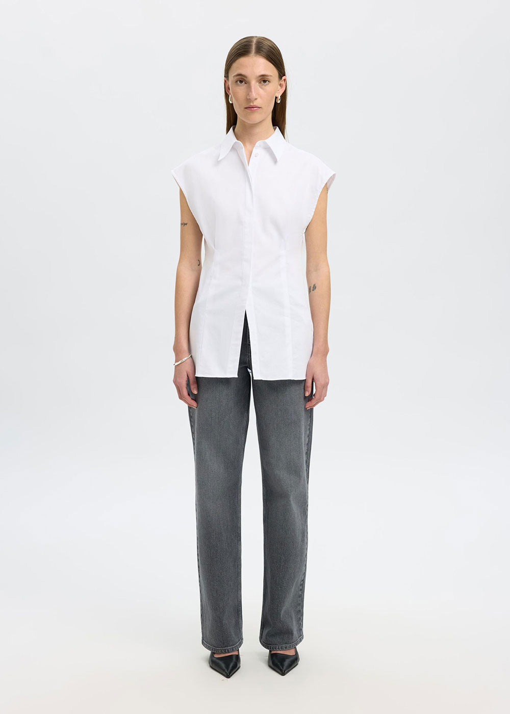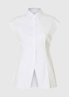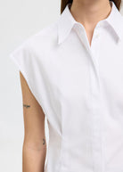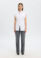 Try something new with your tailored shirt. This one comes in a modern sleeveless design and can be styled alone or under a knitted vest. Wear it with wide-leg trousers and leather loafers.
