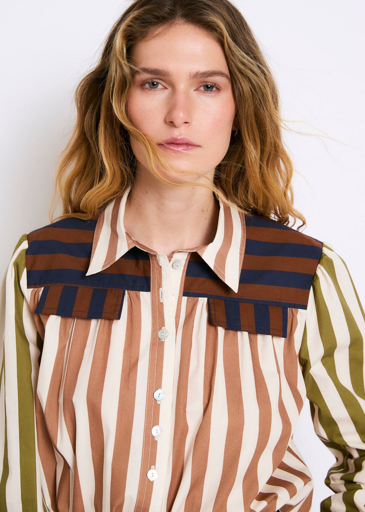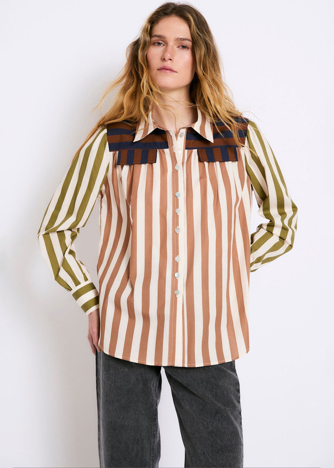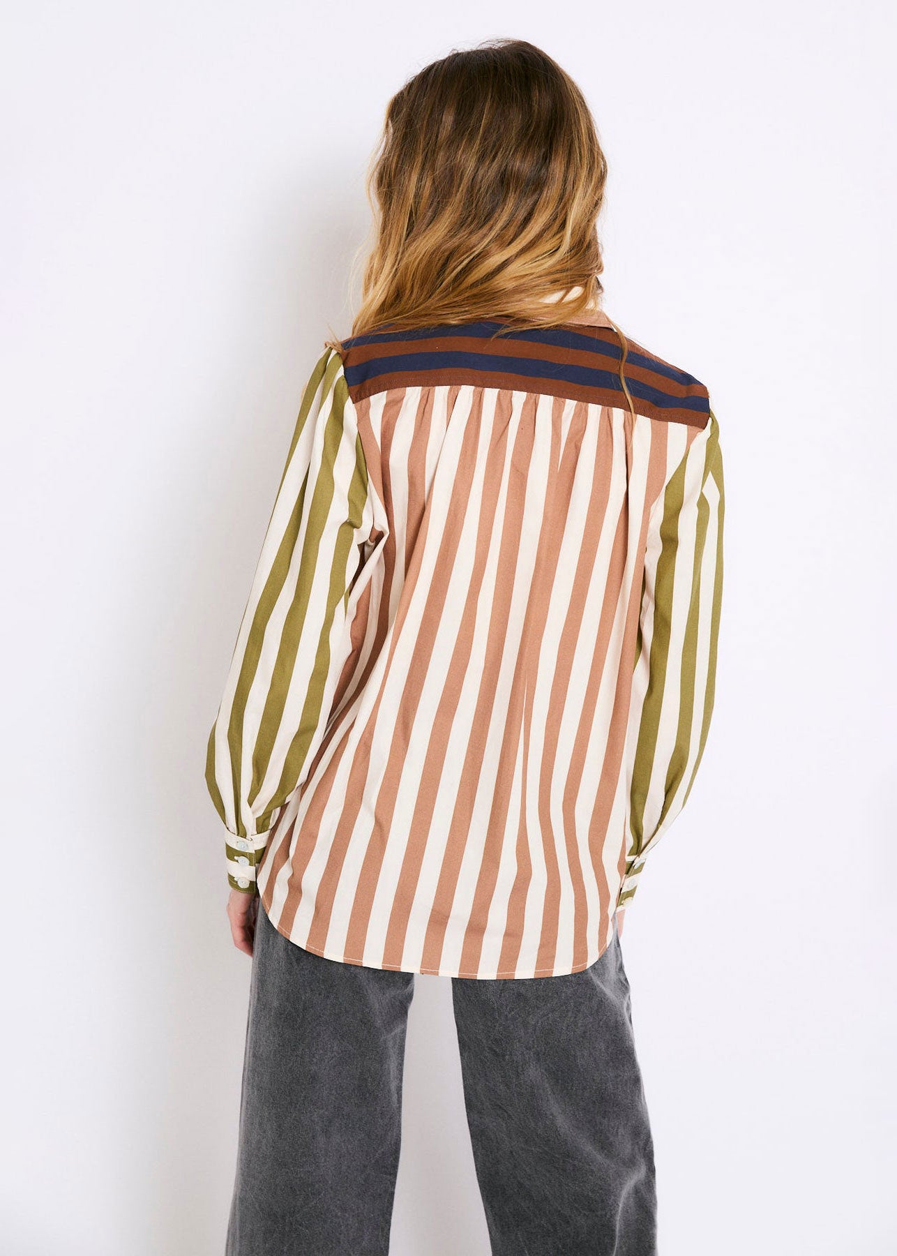 Cotton blouse with contrasting striped print. Olive green sleeves and navy blue and brown details on the shoulders. Straight cut and slightly loose fit, with a shirt collar, central button placket and long sleeves with cuffs.