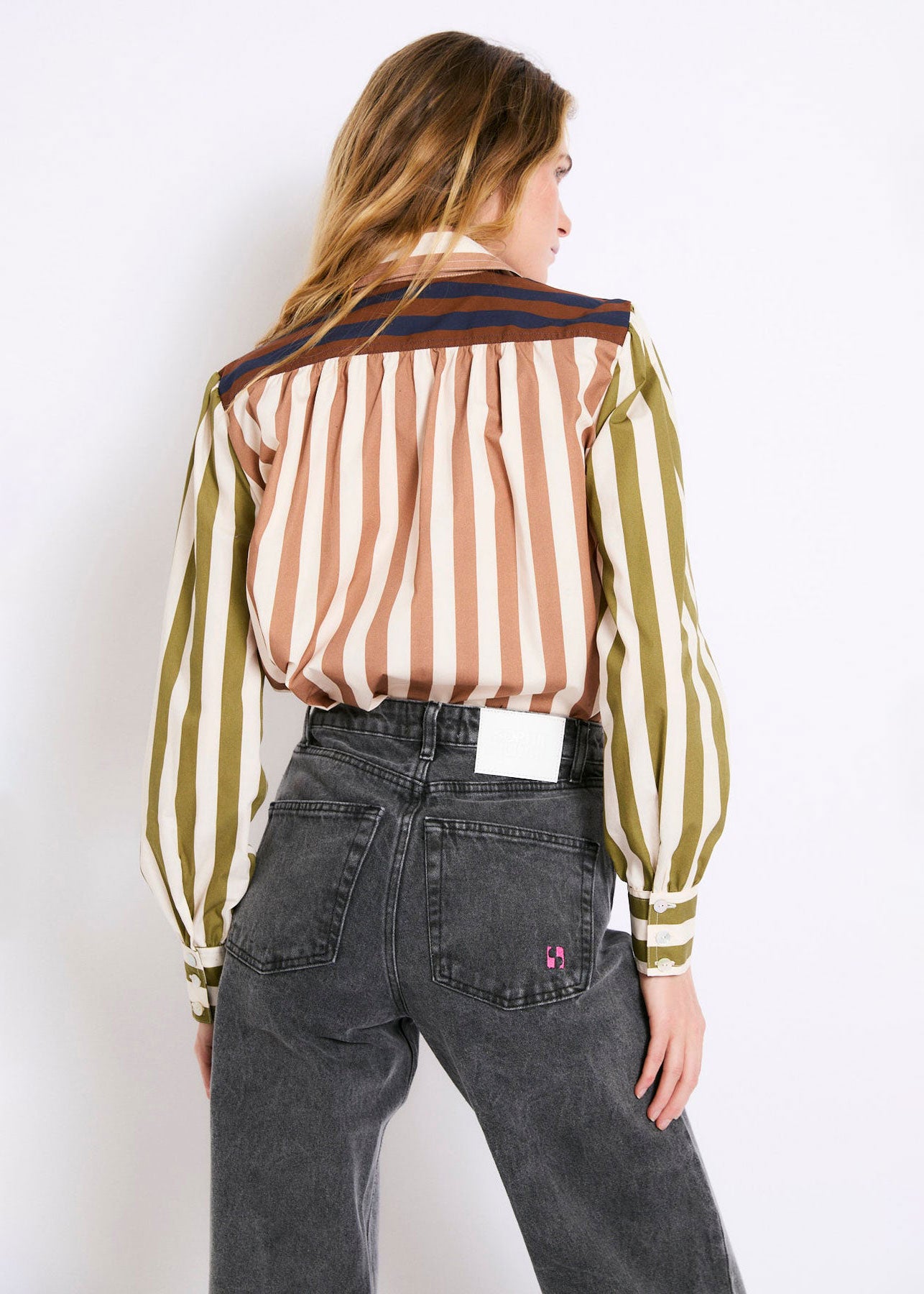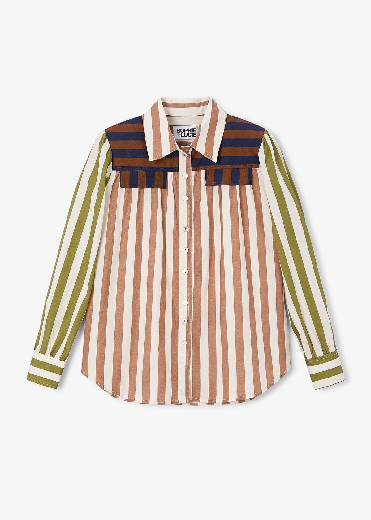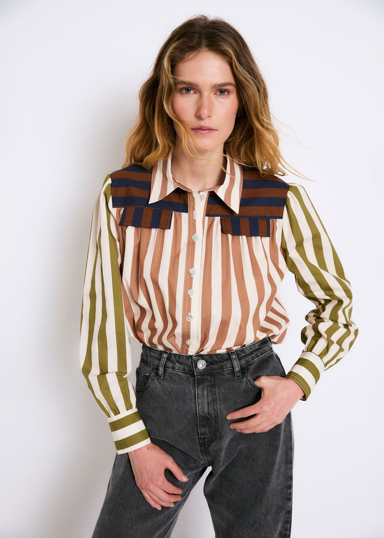 Cotton blouse with contrasting striped print. Olive green sleeves and navy blue and brown details on the shoulders. Straight cut and slightly loose fit, with a shirt collar, central button placket and long sleeves with cuffs.