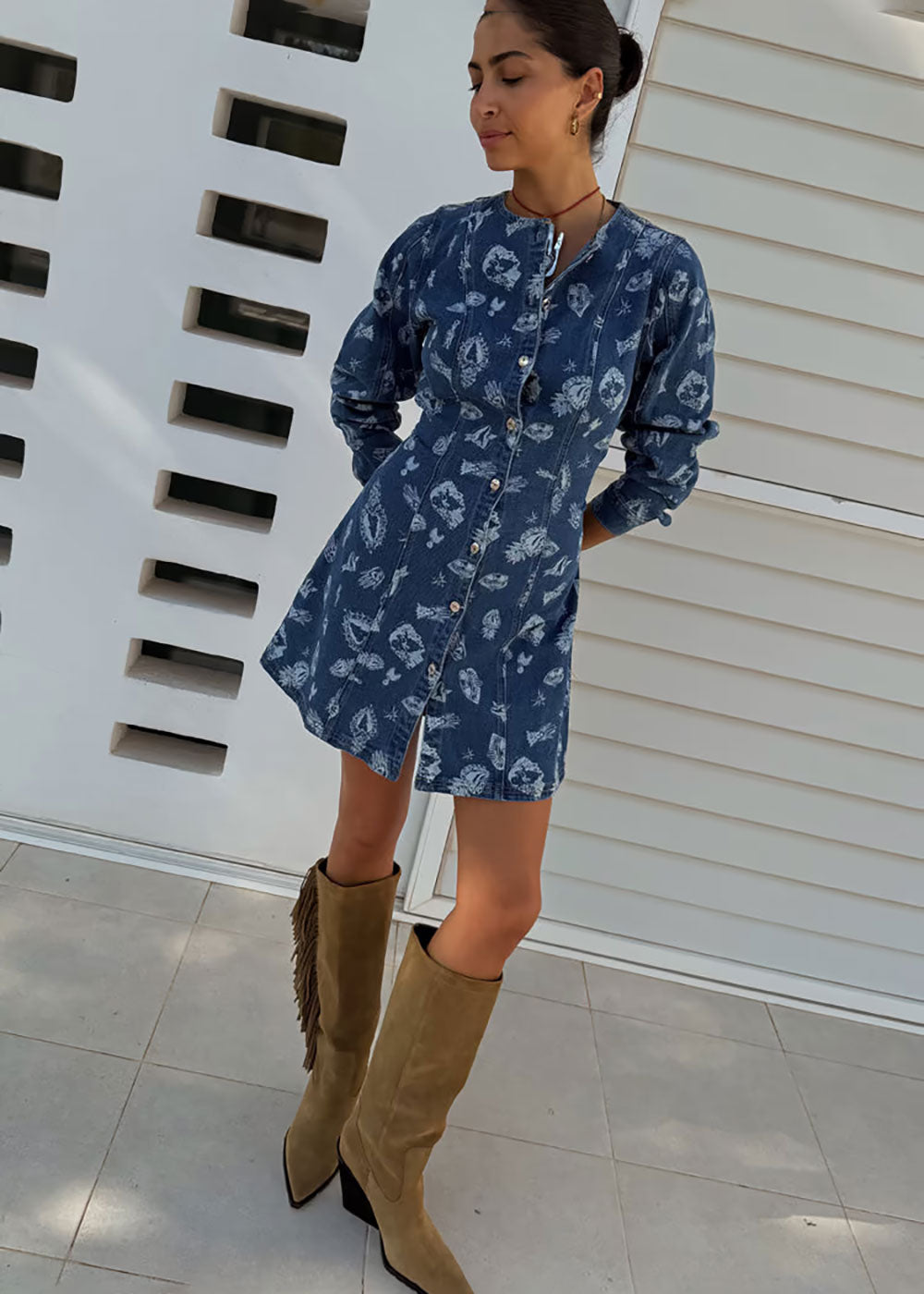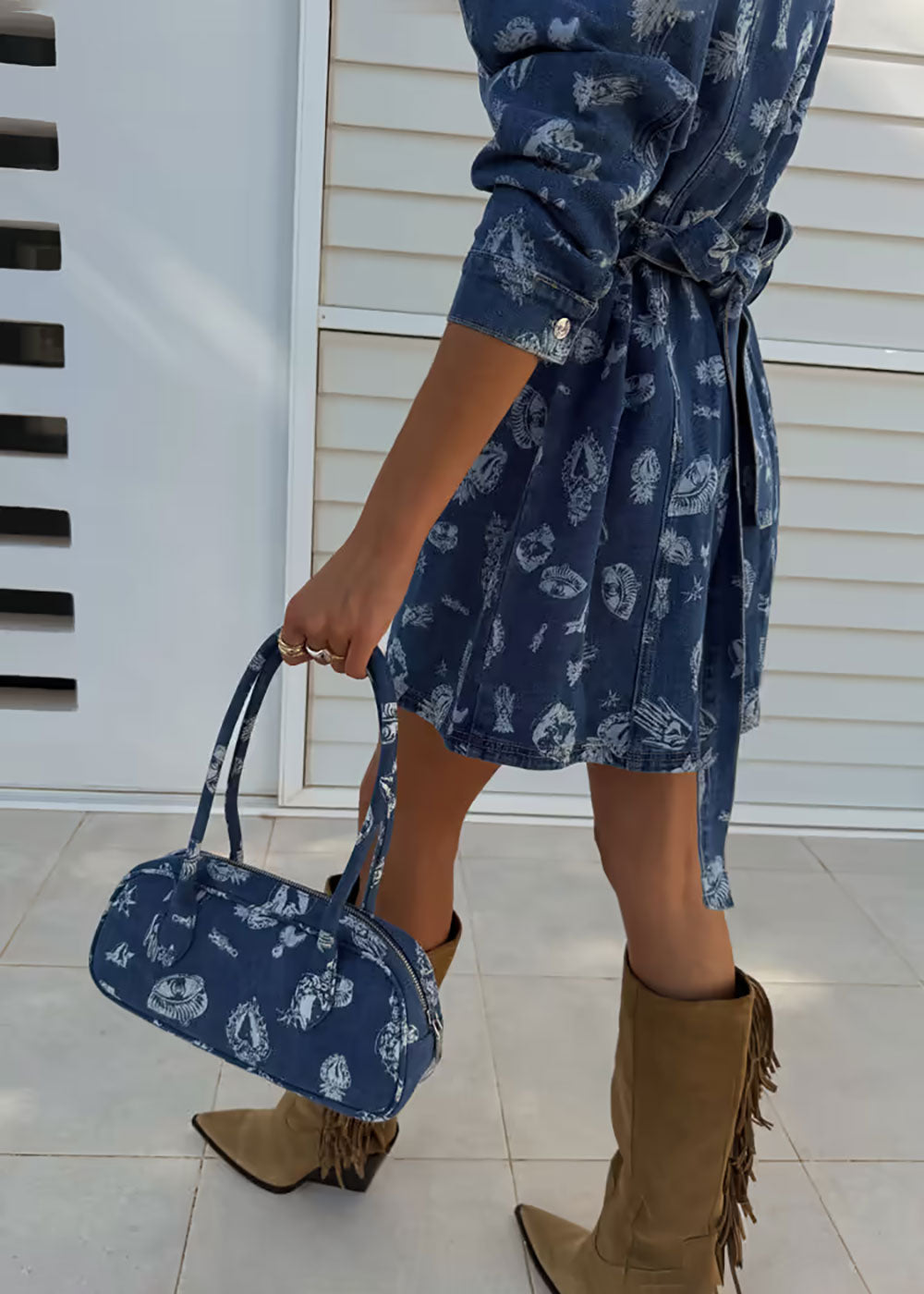 NFD are all about elevating simple silhouettes and the details on this dress definitely turn the simple structure to a staple summer look! In our new deloris print, featuring some of our iconic hand, heart and eye NFD motifs based on hand crafted tin jewellery created by our very own founder, Lucy! With intentionally placed seams, a slight balloon sleeve and a tie waist fastening that cinches you in at the waist. We've paired with a cowboy boot and the matching baguette bag for an effortless day to night look!