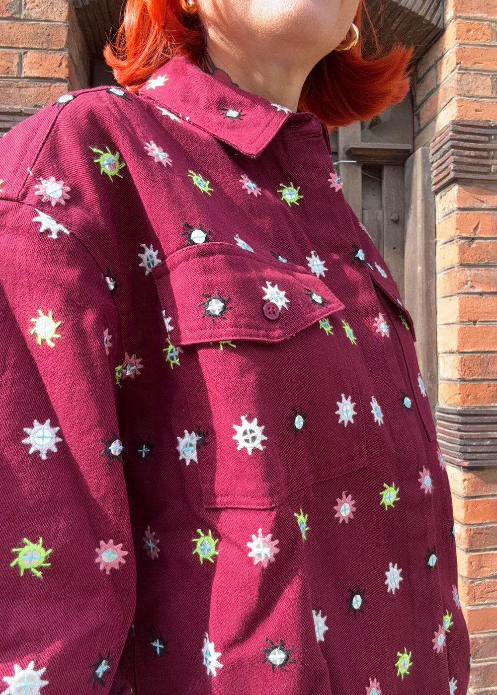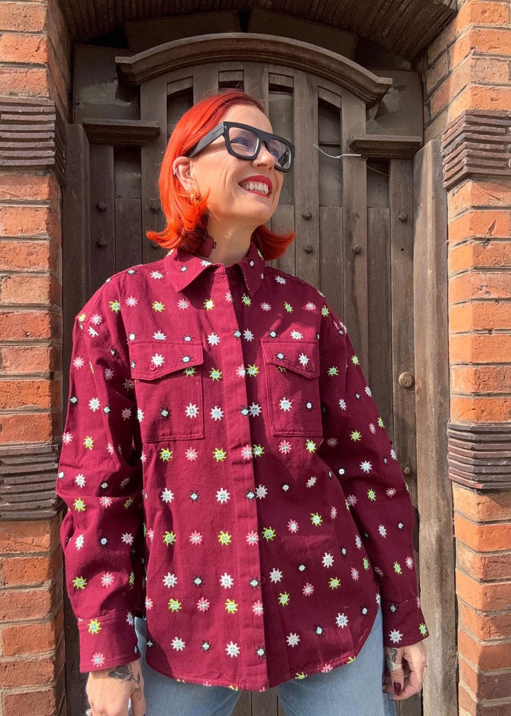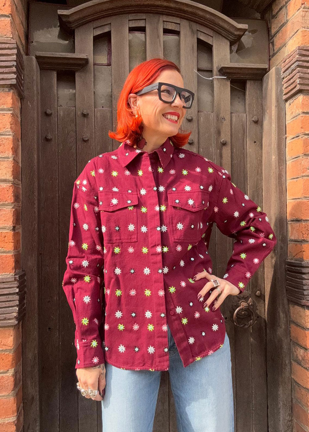 ESSENTIEL ANTWERP Burgundy and multicolor embroidered oversized shirt with mirror accents & flap pockets