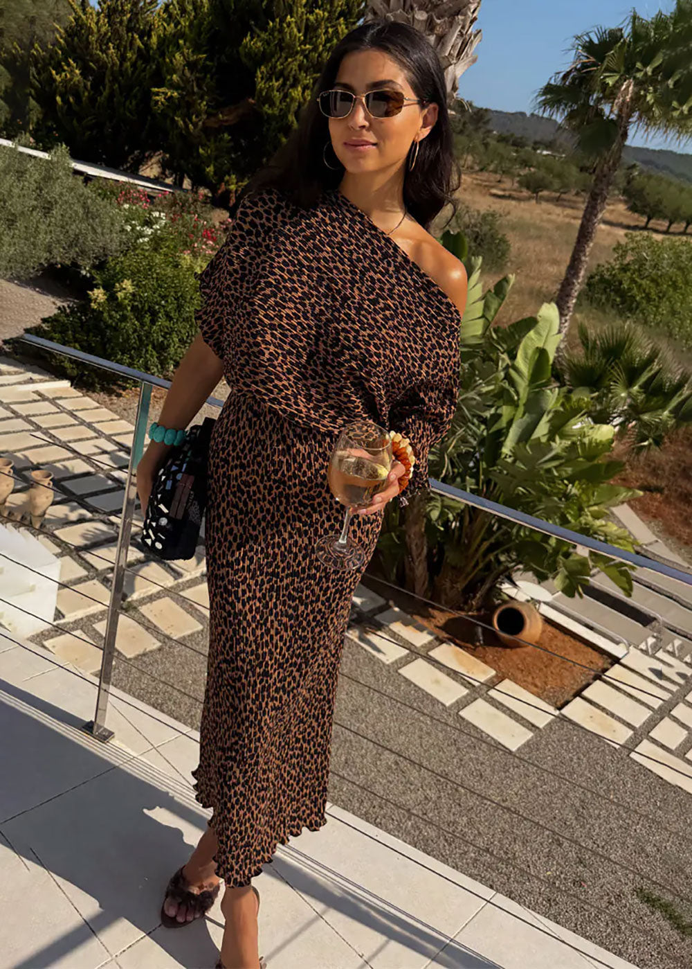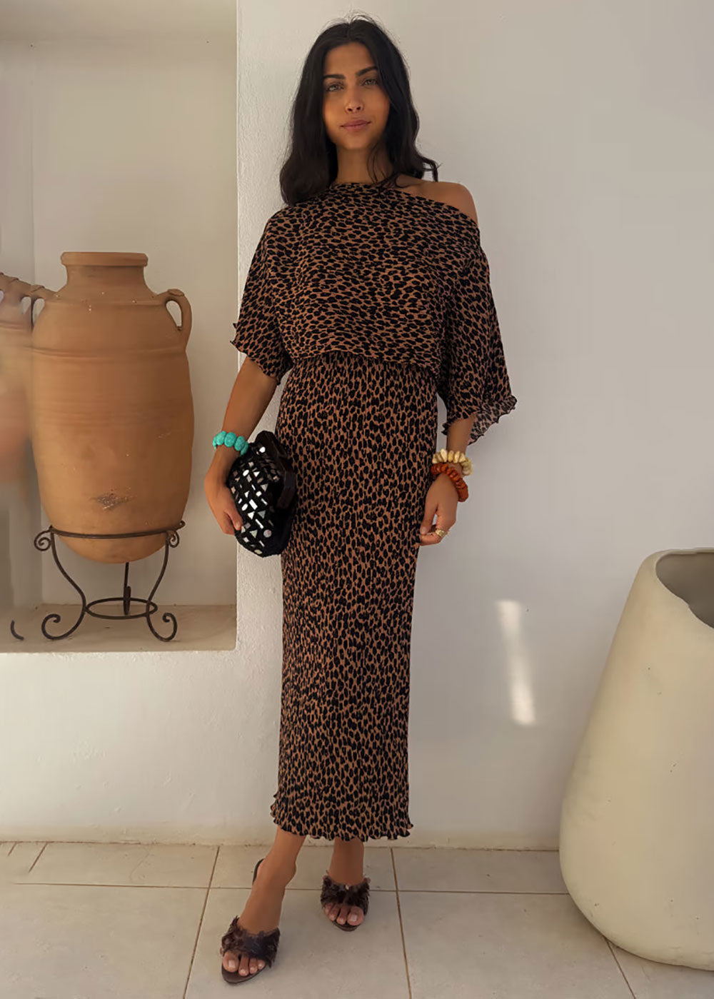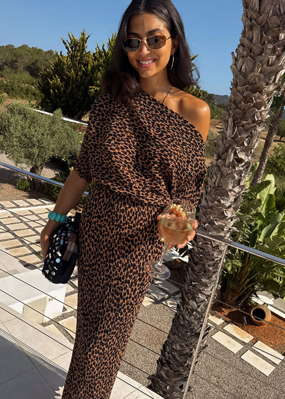 Our best selling Tilly dress in our iconic leopard print that's so trans-seasonal, it's a definite must have for your wardrobe! The slightly relaxed silhouette allows you to style off-the-shoulder while the stretchy plisse fabric and elasticated waistband makes it a so wearable and perfect for wedding guest season! Complete the look with heels and a clutch for a chic finish.