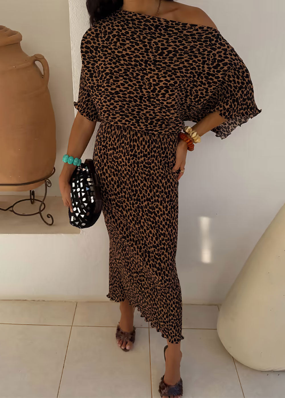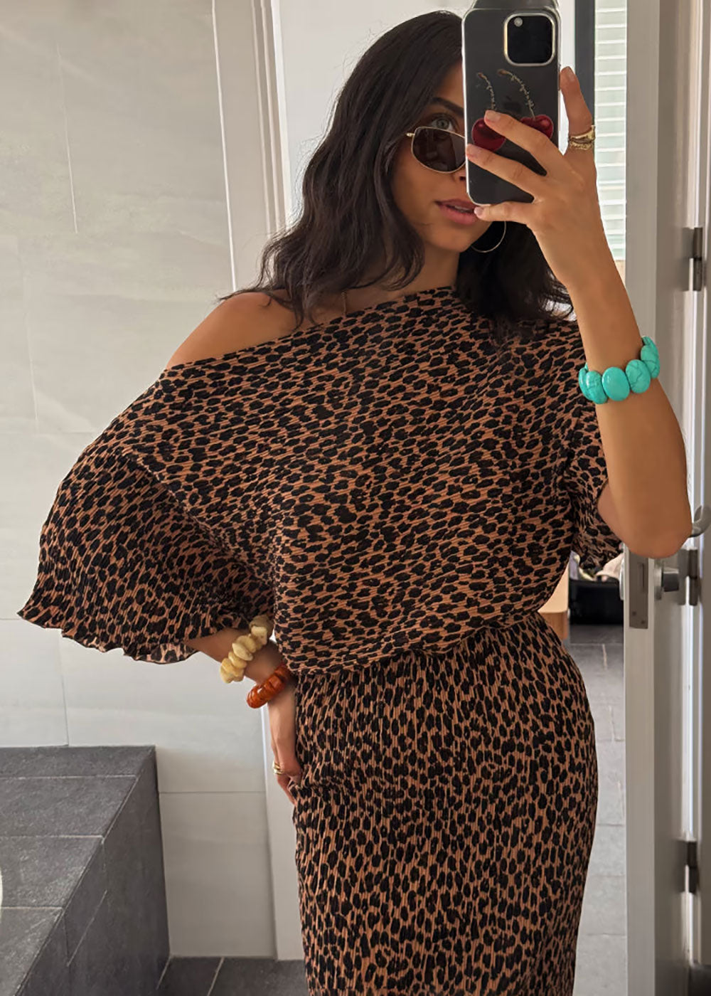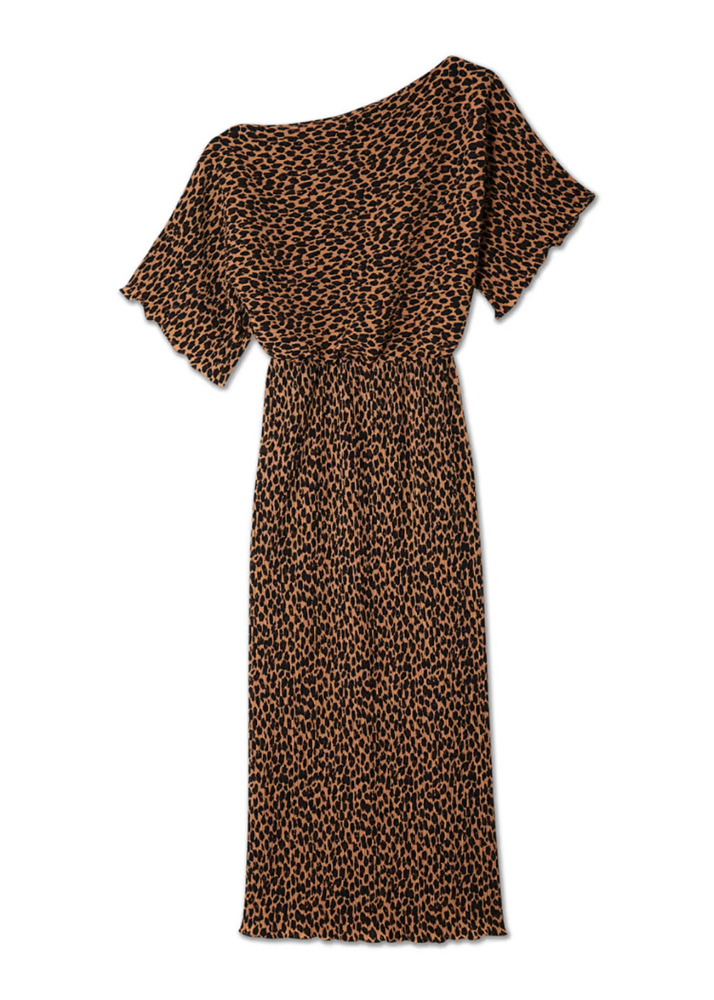 Our best selling Tilly dress in our iconic leopard print that's so trans-seasonal, it's a definite must have for your wardrobe! The slightly relaxed silhouette allows you to style off-the-shoulder while the stretchy plisse fabric and elasticated waistband makes it a so wearable and perfect for wedding guest season! Complete the look with heels and a clutch for a chic finish.
