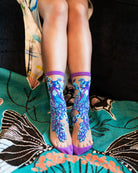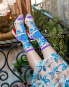 Our Aquamarine Peacock sheer sock is a dazzling stunner with shades of blue, purple, and turquoise. A majestic peacock fans its wings throughout the sock, creating a dramatic effect that will make you the envy of all your friends. This fancy sock is your go-to anytime you want to add sheer magic to your look. Pair with sandals and heels and wear all the way into holiday season.