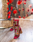 Our Cocktail Hour black sheer sock features wine glasses, martinis, and wine bottles with an unexpected olive twist. The graphic print and electrifying colors give this sock an art museum vibe, perfect for paint and sip nights with the girls. Finished with a mulberry colored cuff, heel, and toe for a sultry look.