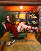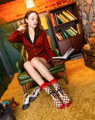 Our Polka Dot Bow Ruffle sheer sock is not your average polka dot sock. We added the Sock Candy touch with an unexpected oversized bow and red ruffle cuff, while keeping the colors classic in black and red. This sock brings old Hollywood meets coquette-core energy to your wardrobe.