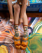 Inspired by vintage tapestries, our Tree of Life Sheer Crew Sock features a lush tree design with ornately whimsical buds. Uniquely complex, this sock offers more than what meets the eye with different views of the tree from the side and the front in a mirrored pattern. The burnt orange heel, toe, and cuff gives this style all the Fall vibes.