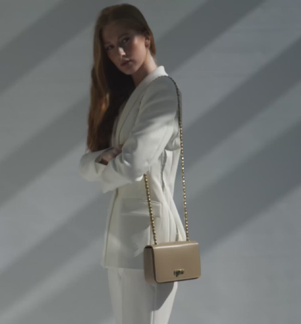 The Grace Bag exudes timeless elegance with a hint of opulence, seamlessly transitioning from day to night. Crafted from premium box leather, this lightweight, compact accessory offers versatility with both shoulder and crossbody wear.