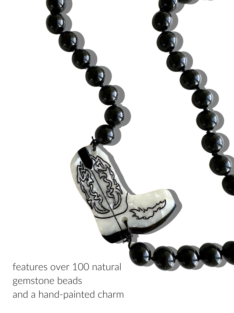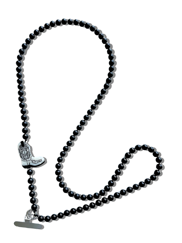 Works with your existing phone case - perfect for when you want to go hands-free! crafted by our solar eclipse artisans, our phone chains are handmade and hand-painted. each chain features over 100 natural gemstone beads and our iconic hand-painted Western Boot charm. our phone chains are designed to work with your existing phone case, thanks to a clever small insert that slips into the back of your phone case. no need to remove the phone chain for charging. fits phone cases with a charger opening at least 3/8" wide. our phone chains are highly functional tech accessories as well as beautiful pieces of jewellery. Carefully hand-crafted from exceptional eco-friendly materials including our signature, biodegradable wood-pulp acetate and natural gemstones. each chain comes in our signature plastic-free packaging including a hang-sell gift box as well as a case style packaging card for in-store try-ons.