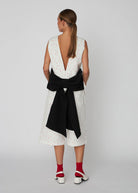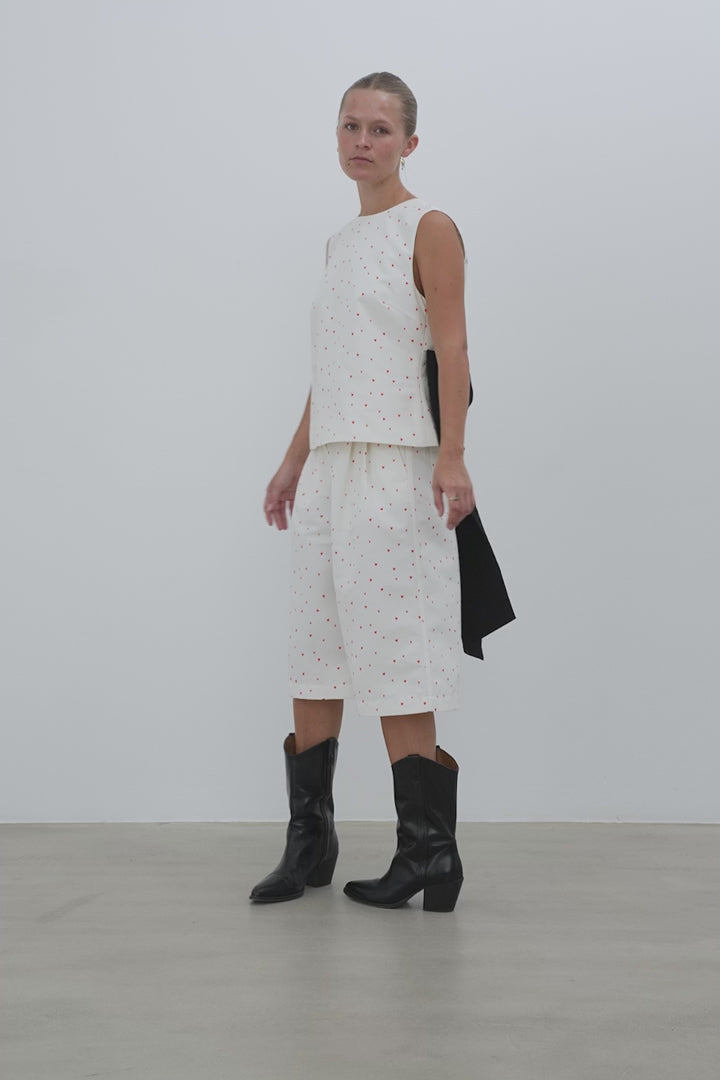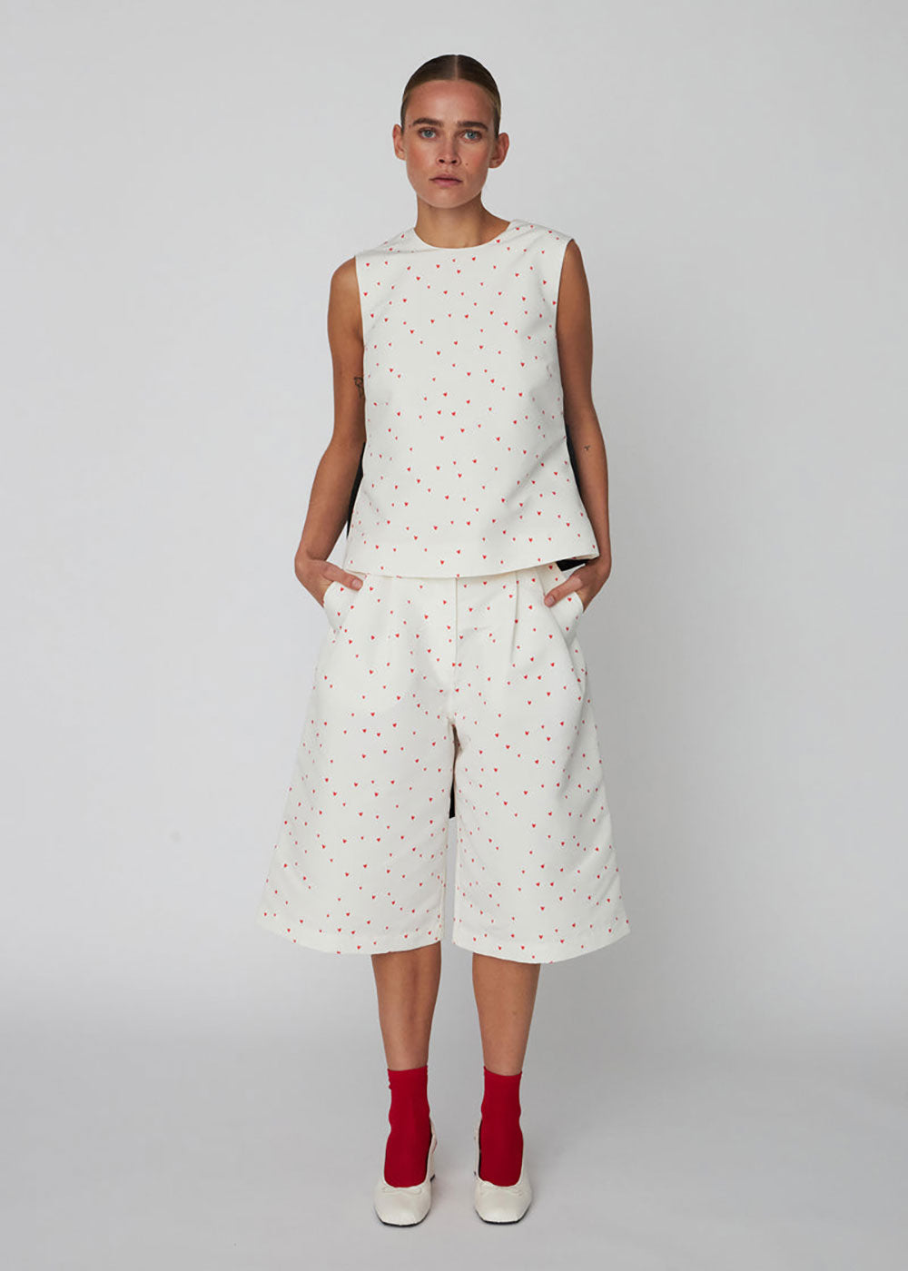 Sleeveless top with a heart pattern, featuring a round neckline and a low-cut back. The design includes a large contrasting bow at the back.