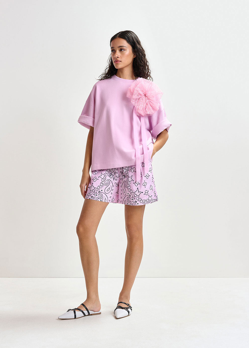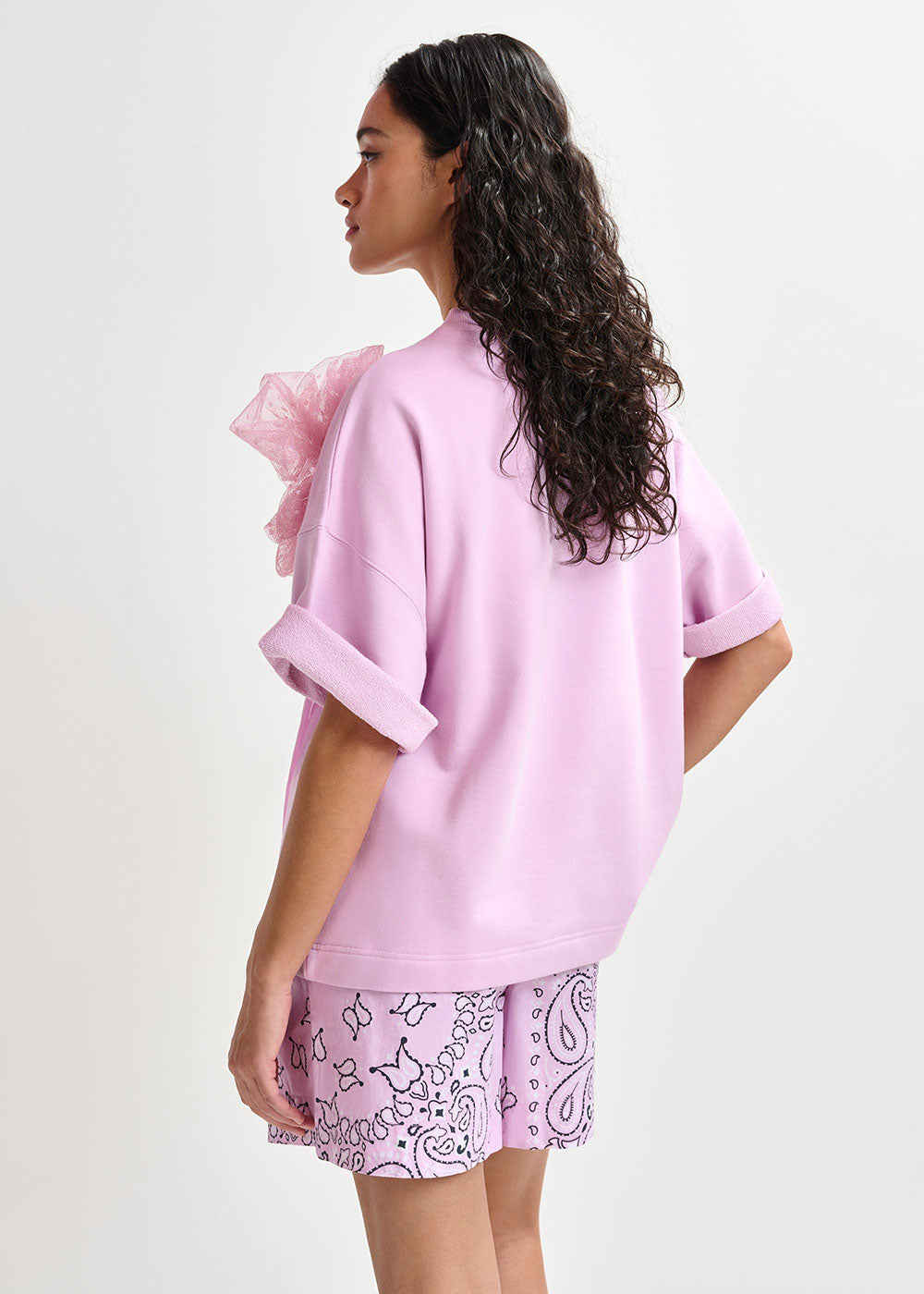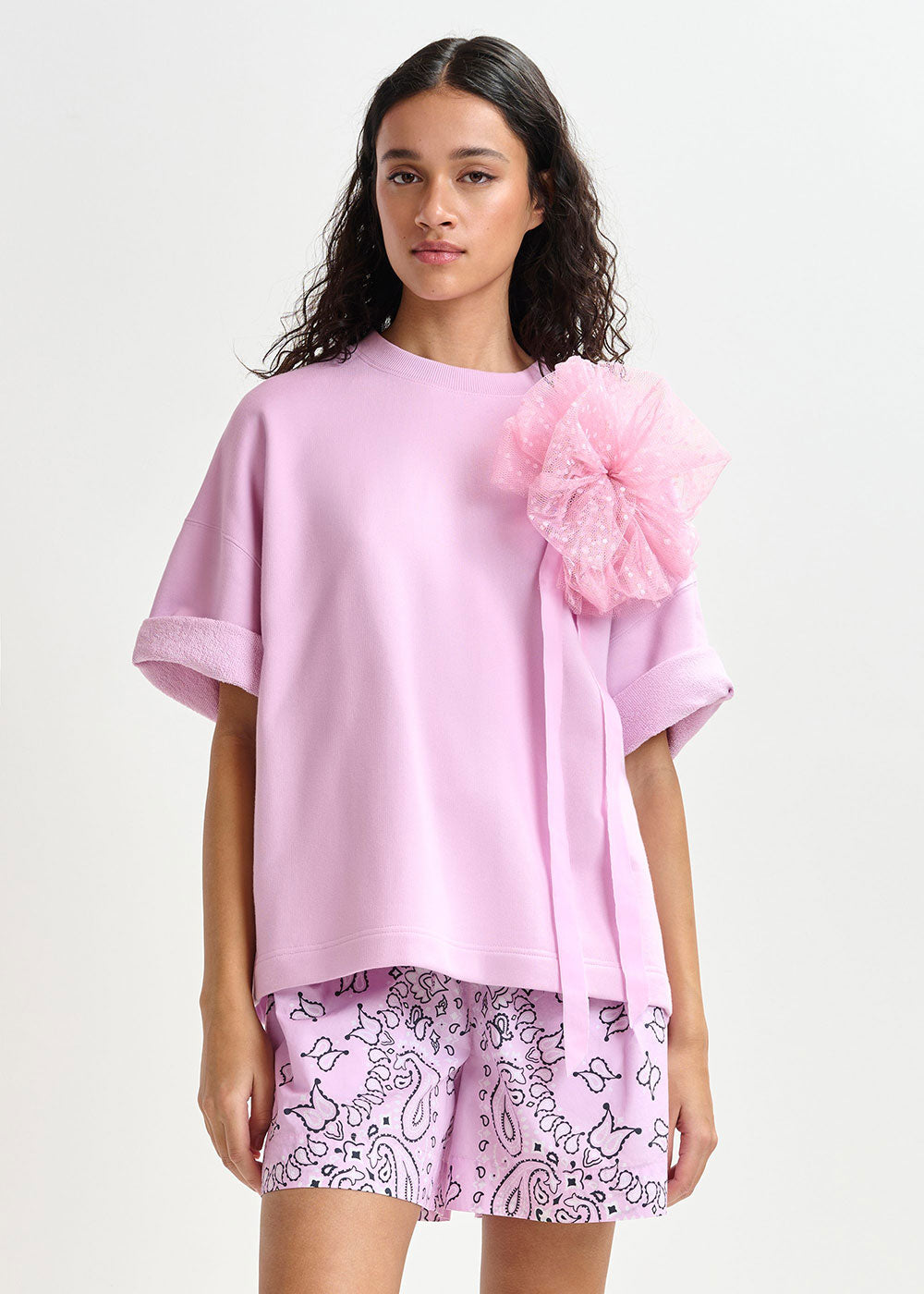 Crafted from soft cotton-blend jersey, this cozy sweatshirt offers a relaxed boxy silhouette with a round neckline and dropped shoulders. The short sleeves, designed to hit just above the elbow, provide a comfortable yet stylish fit. Finished with a unique mesh brooch and pin that can be easily removed, this piece combines effortless style with customizable flair.
