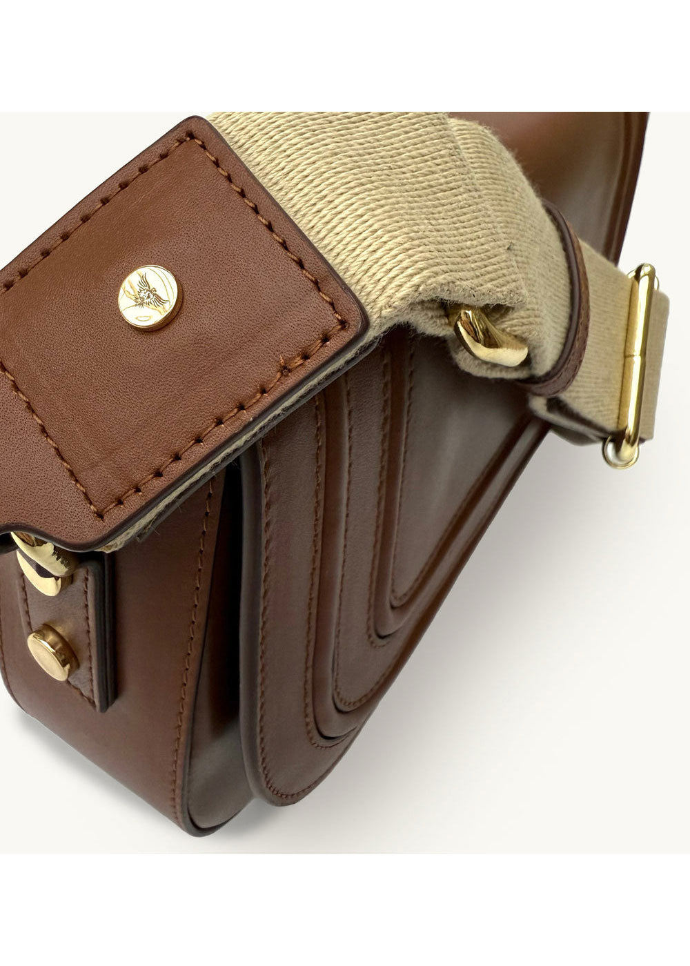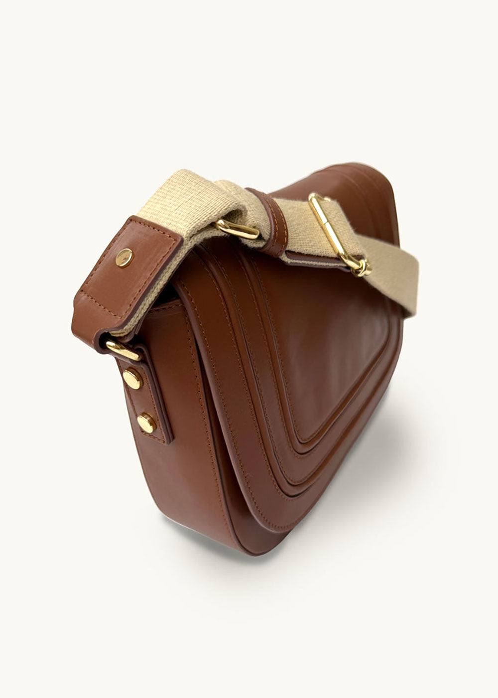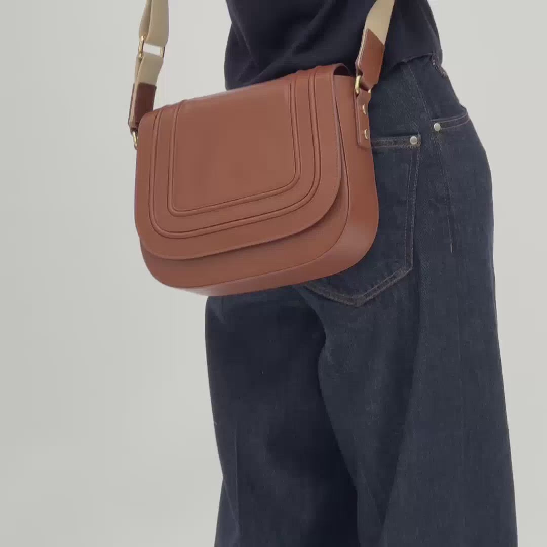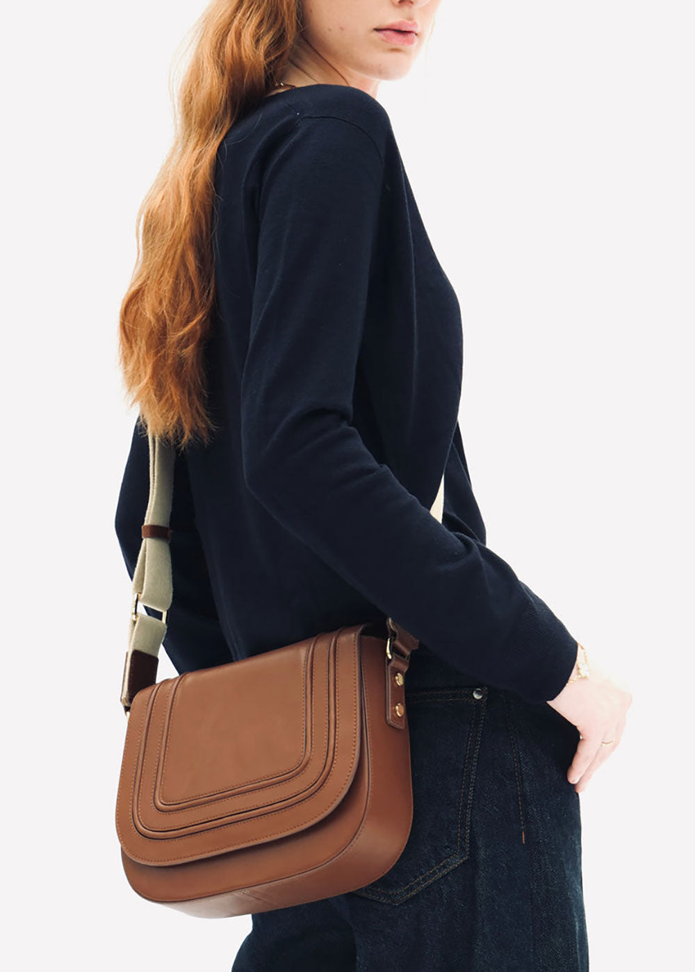With its clean, rounded lines and intricate saddle stitching, the Mimi Maxi showcases a refined yet relaxed design. The adjustable canvas strap allows for versatile wear, offering comfort whether carried over the shoulder or styled as a cross-body bag.