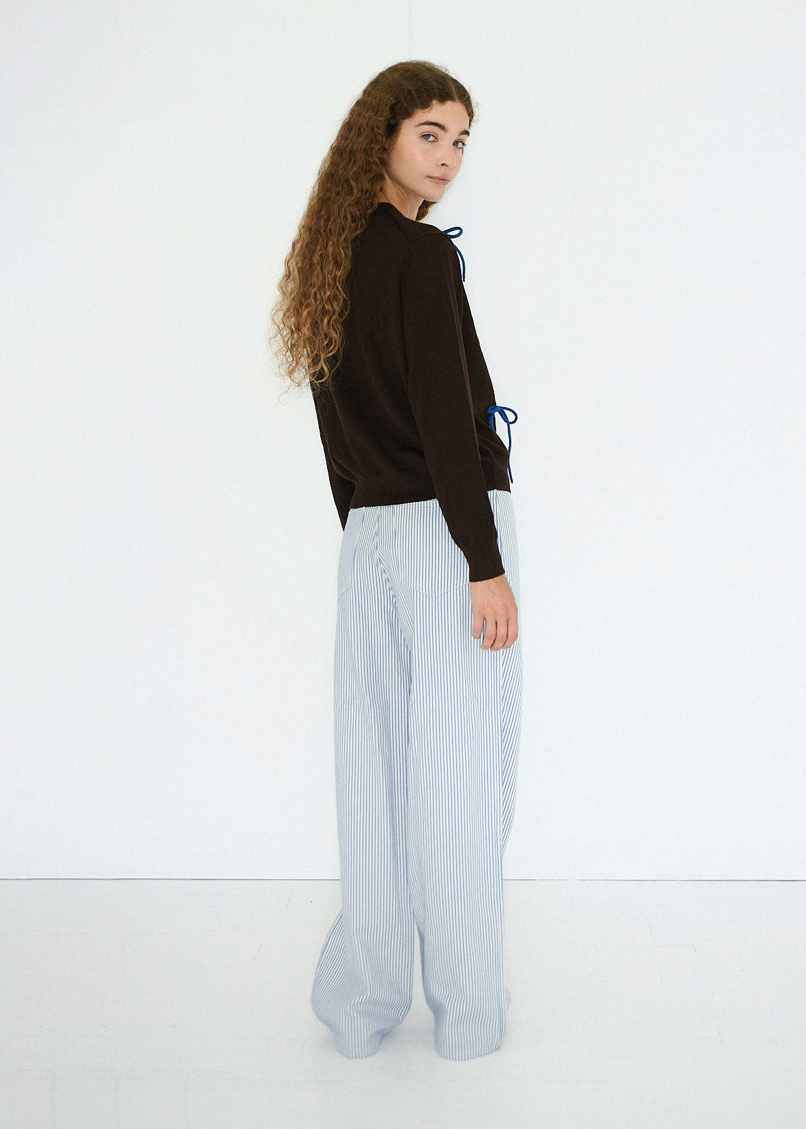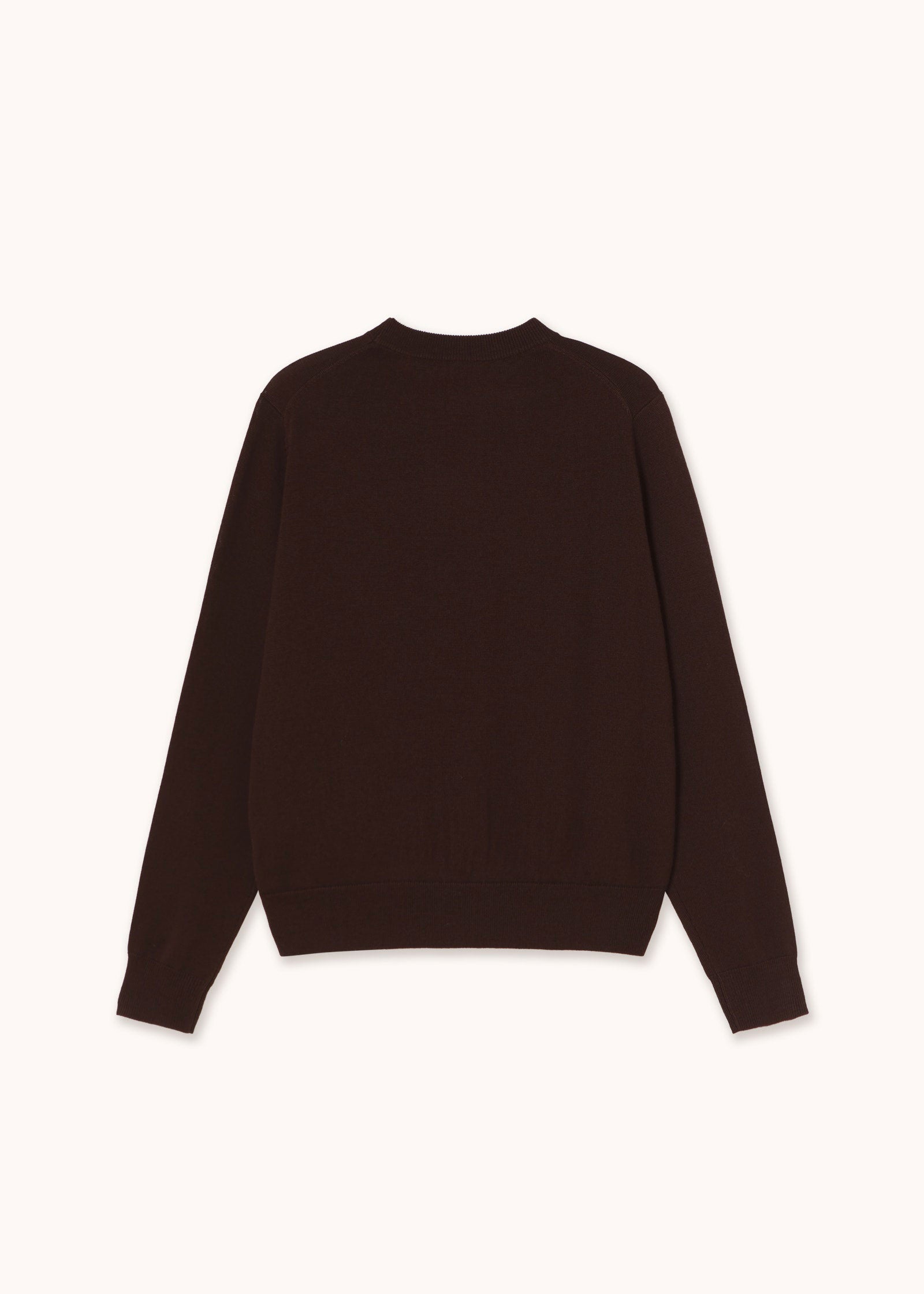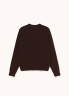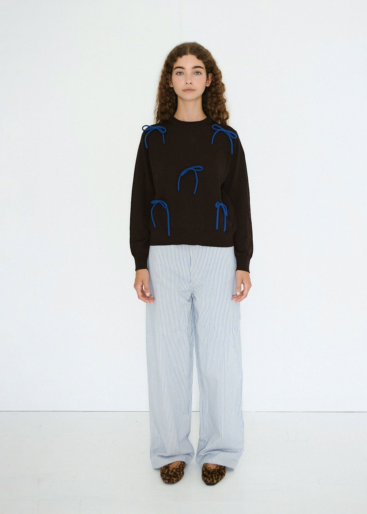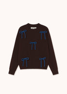 Crafted from extrafine merino wool in a dark brown base. Features a round neck, ribbed hems, and small bows in a contrasting colour placed across the body. Fully fashioned for a clean, structured fit.