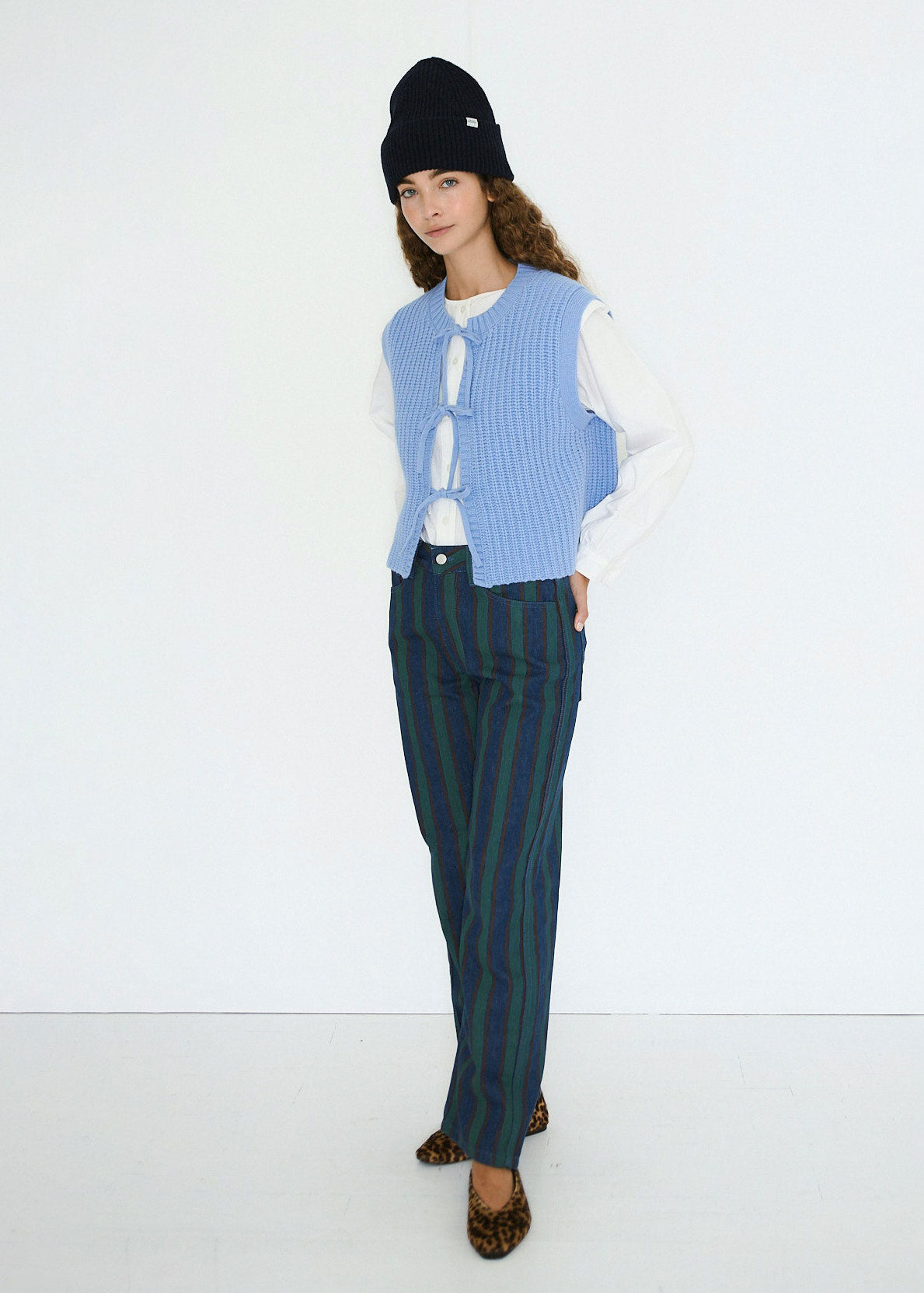 Denim blue merino wool vest with fisherman’s rib texture and lace-detail closure. A refined, textured piece for effortless winter layering.