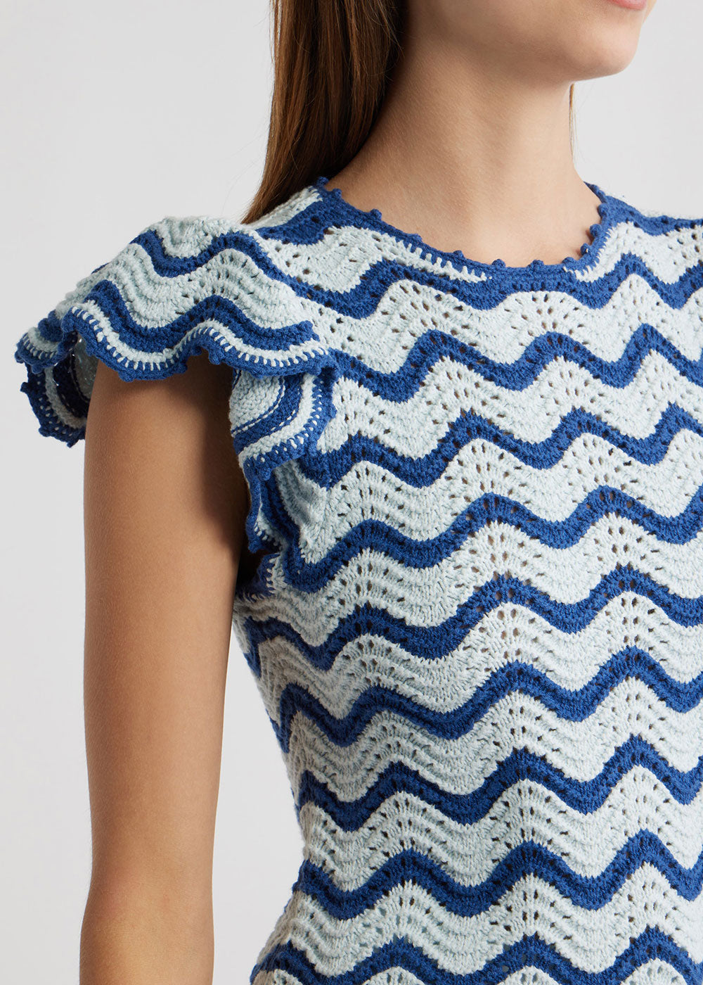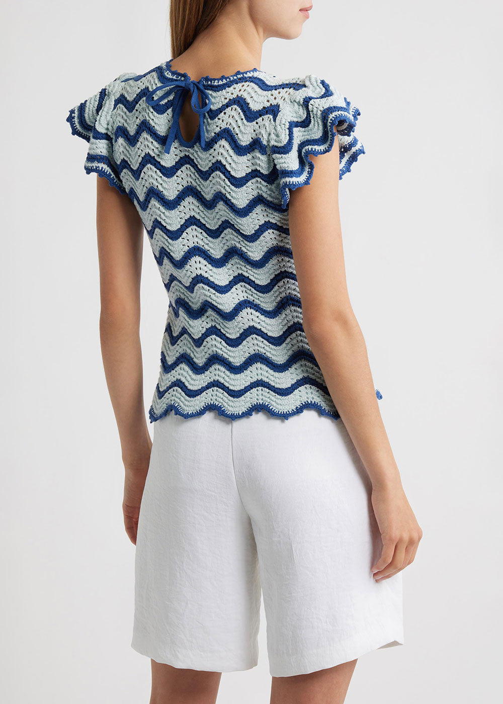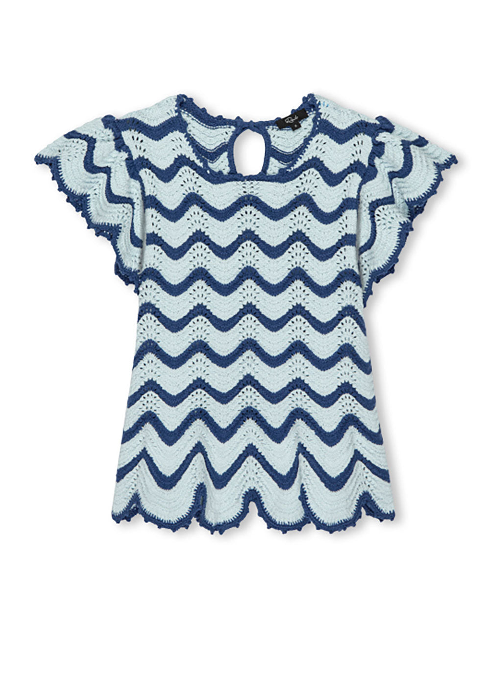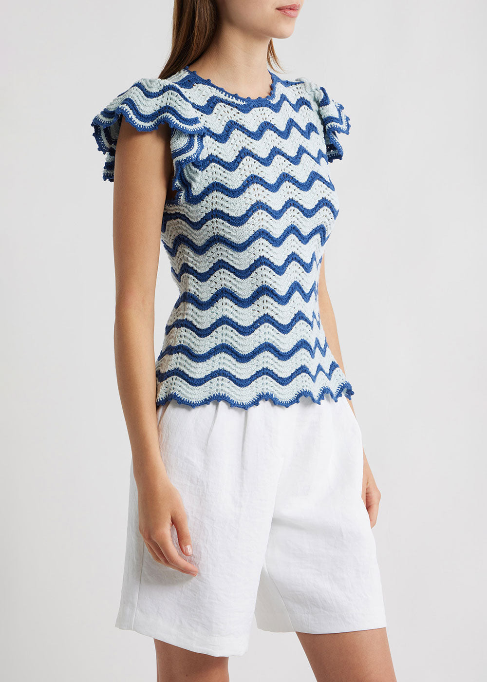 A cotton blend crochet t-shirt with flutter sleeves, delicate eyelet details, and scalloped edging. Compete with a crewneck, keyhole opening, and adjustable tie for an airy fit, the Coen does nautical with a twist