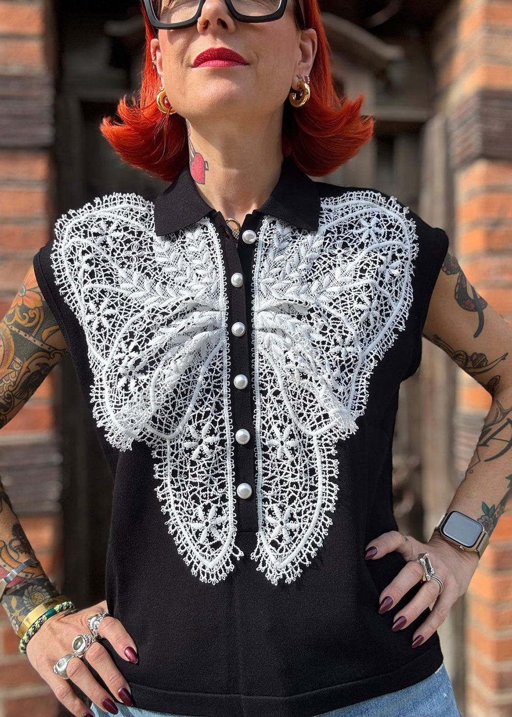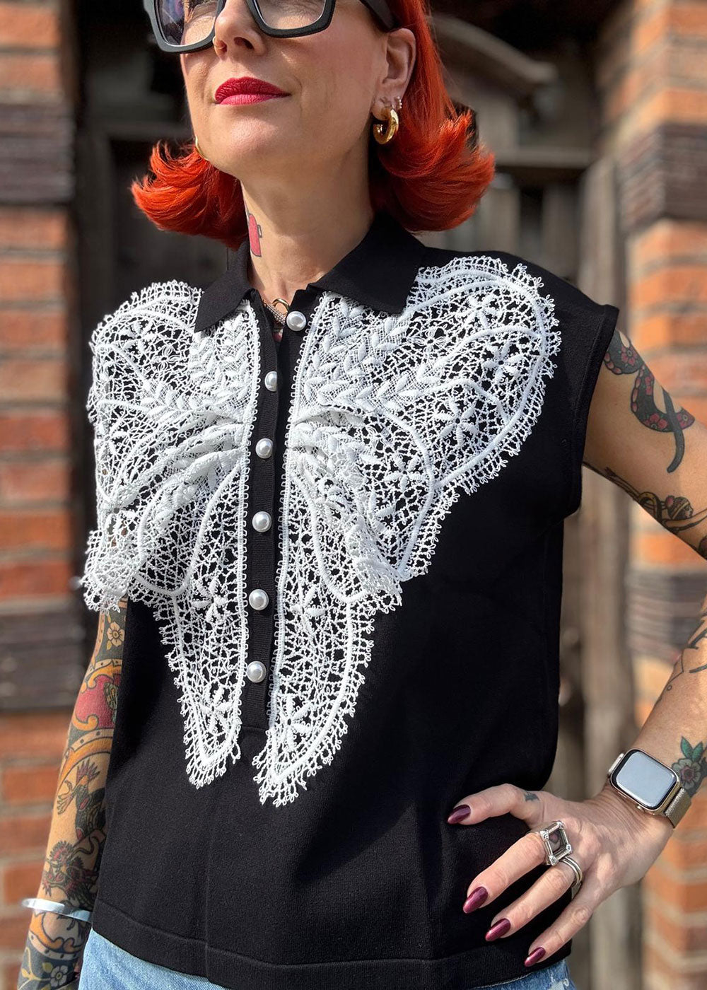 Sleeveless polo blends classic charm with modern detail. Featuring intricate lace accents across the chest and collar, it’s finished with delicate pearl button fastening. Feminine, fresh, and easy to dress up or down.