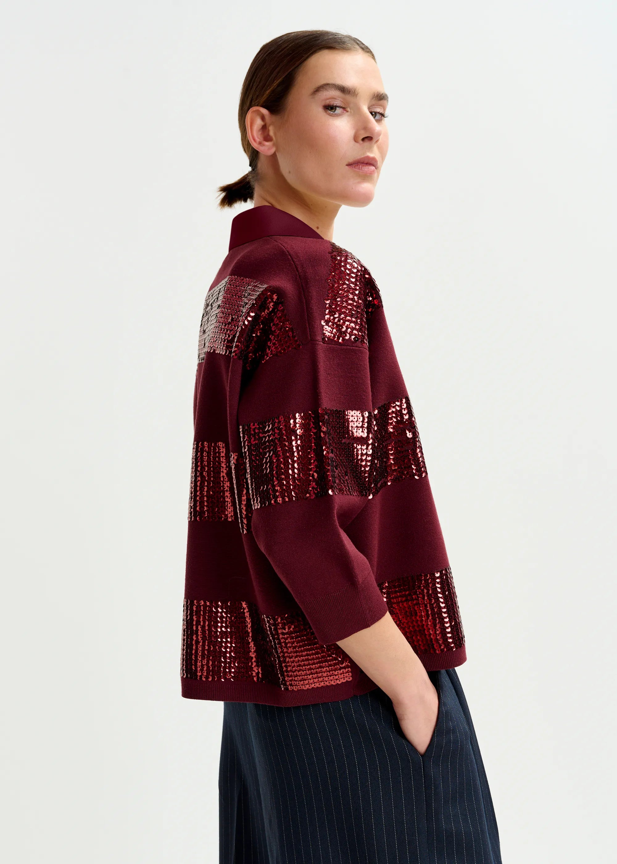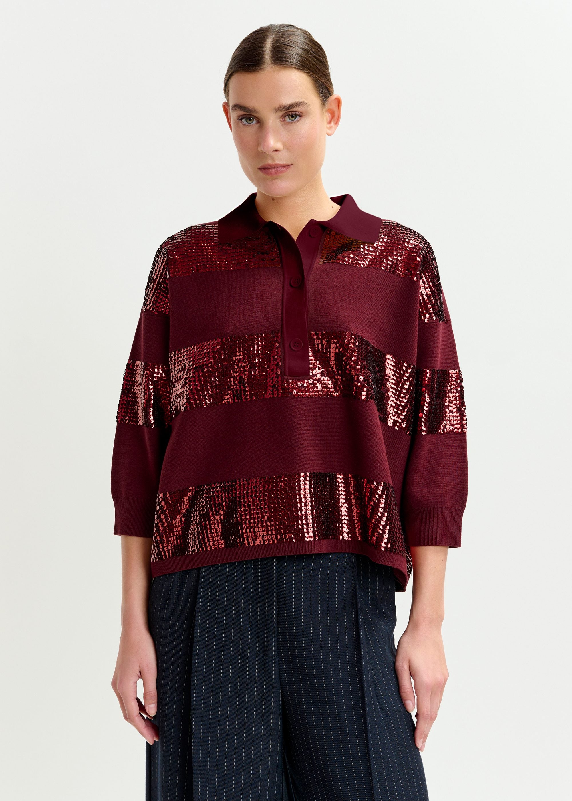 Fine-knit polo blends sporty structure with statement sparkle. Designed for a relaxed fit, it features sequin-embellished stripes across the body and sleeves, contrasted by a bold collar and placket. Dropped shoulders, 3/4 sleeves, and a subtly curved hemline add ease to the silhouette, while ribbed trims provide a clean finish.