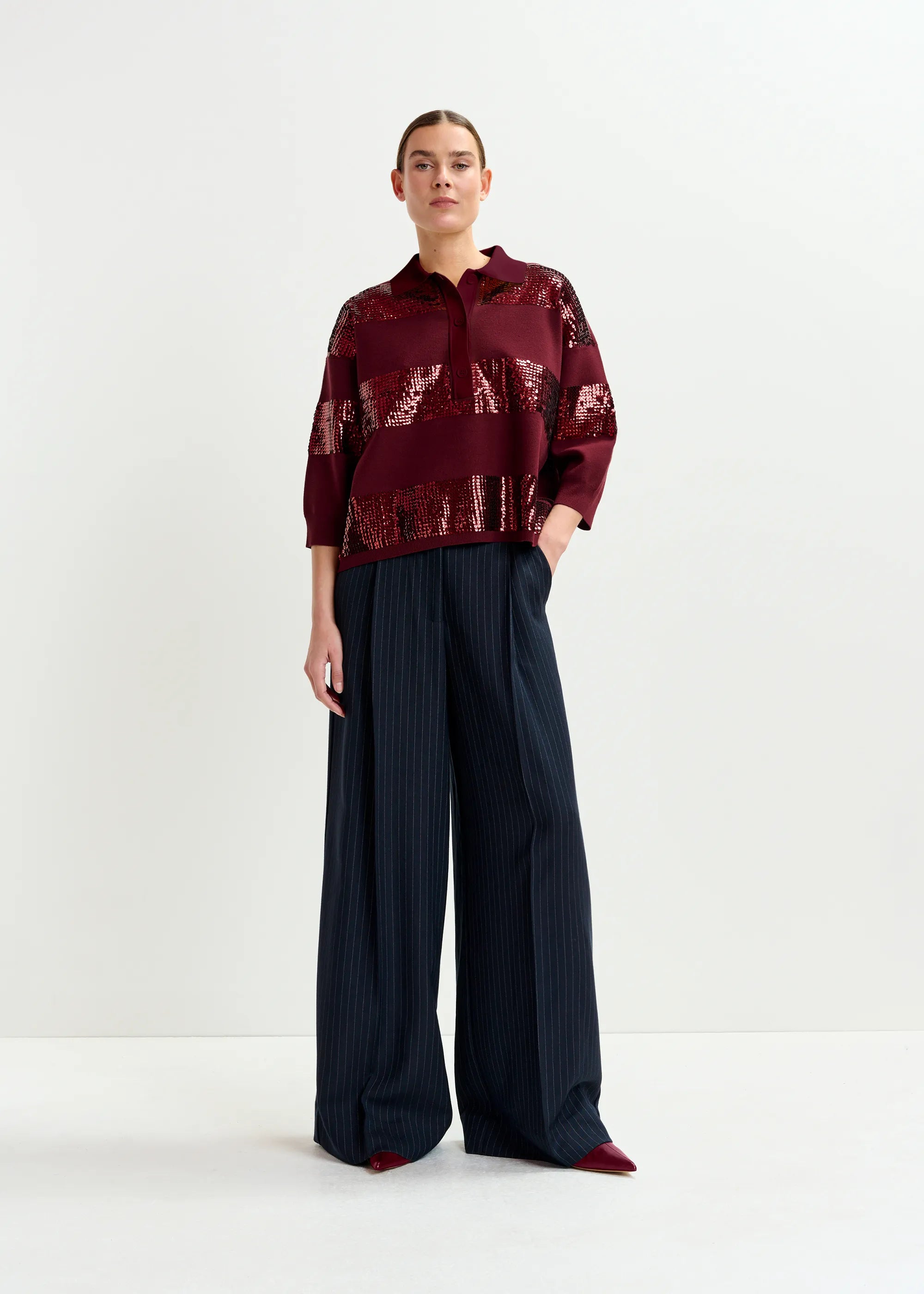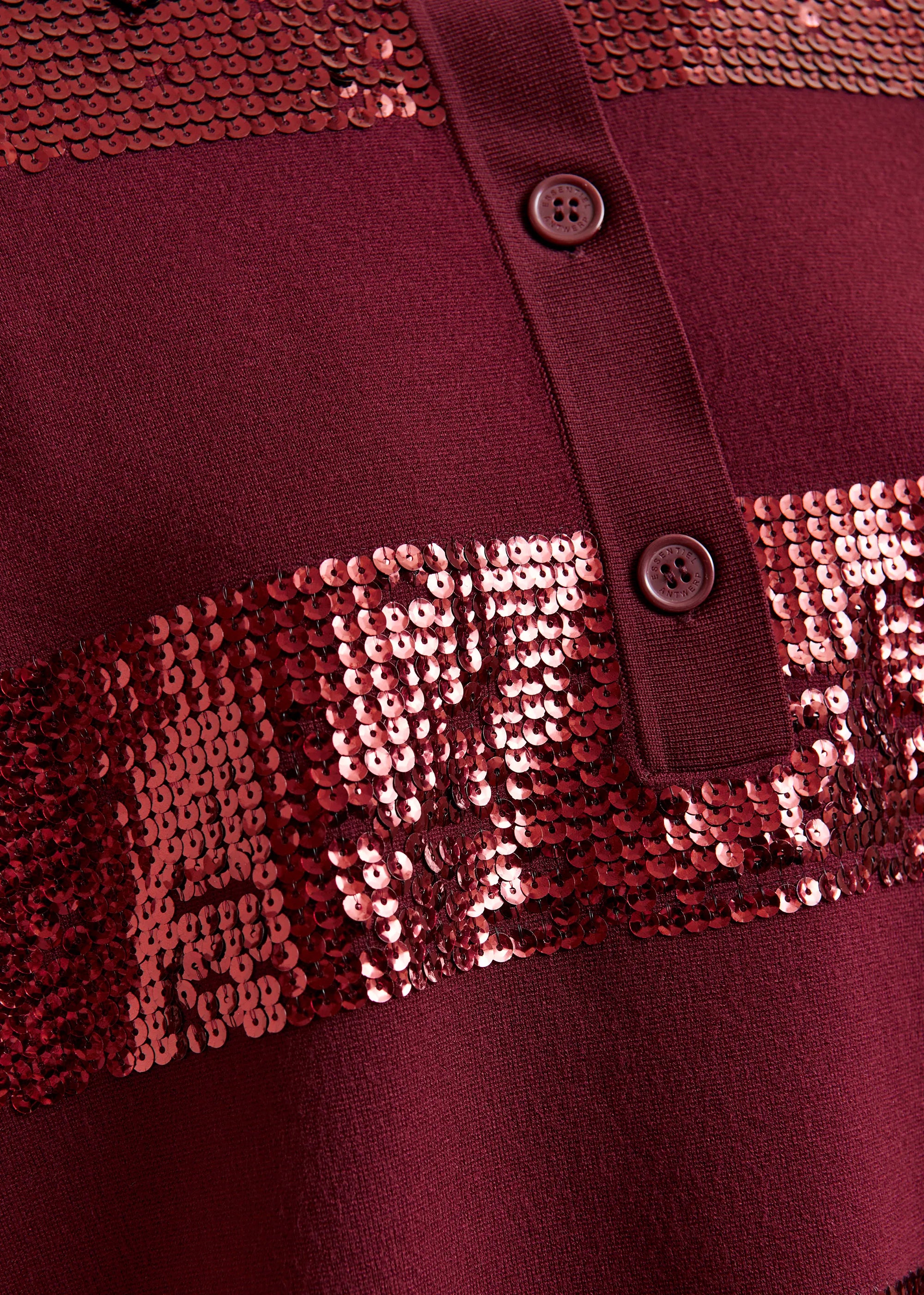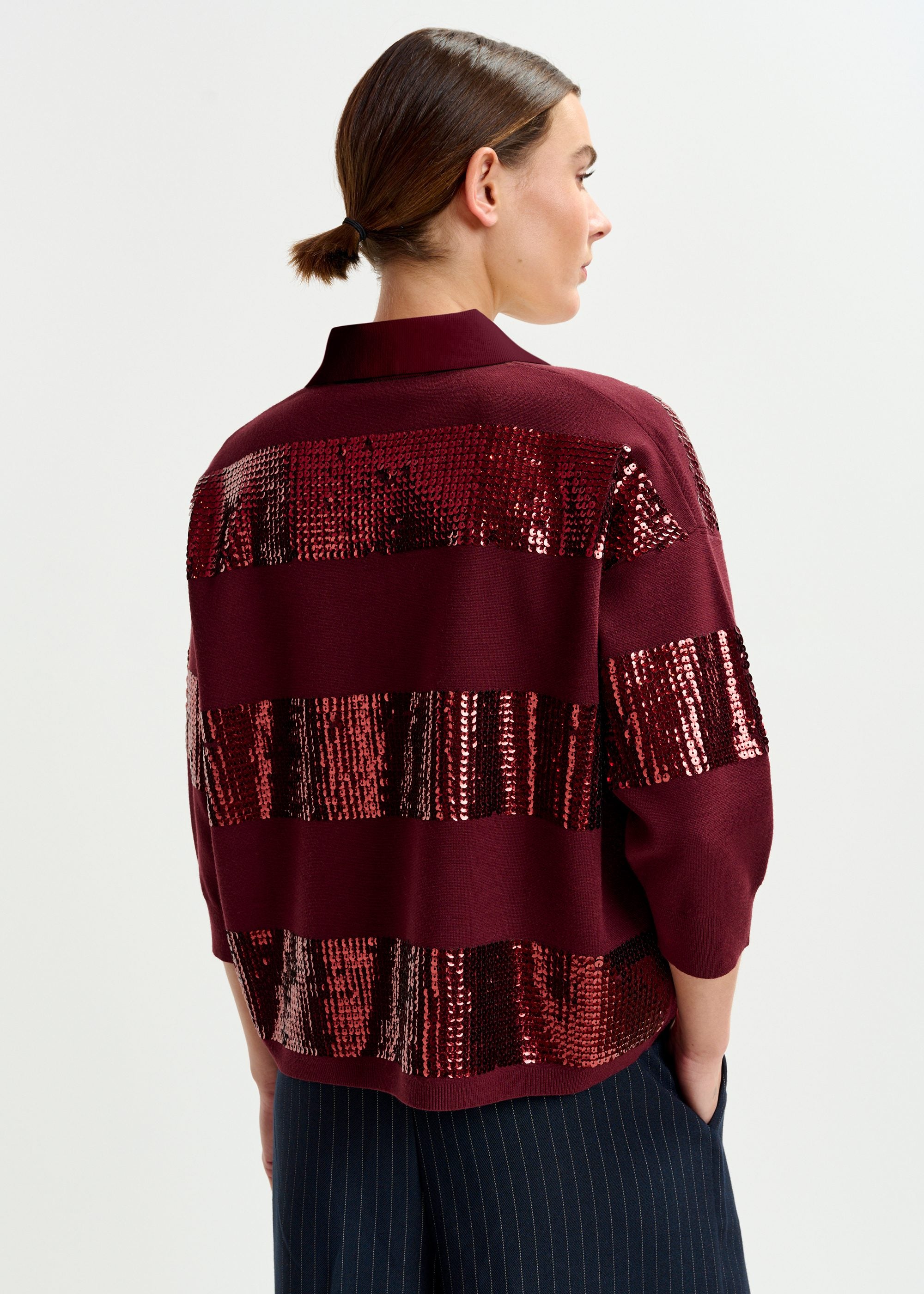 ESSENTIEL ANTWERP Burgundy striped sequin-embellished polo