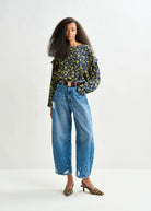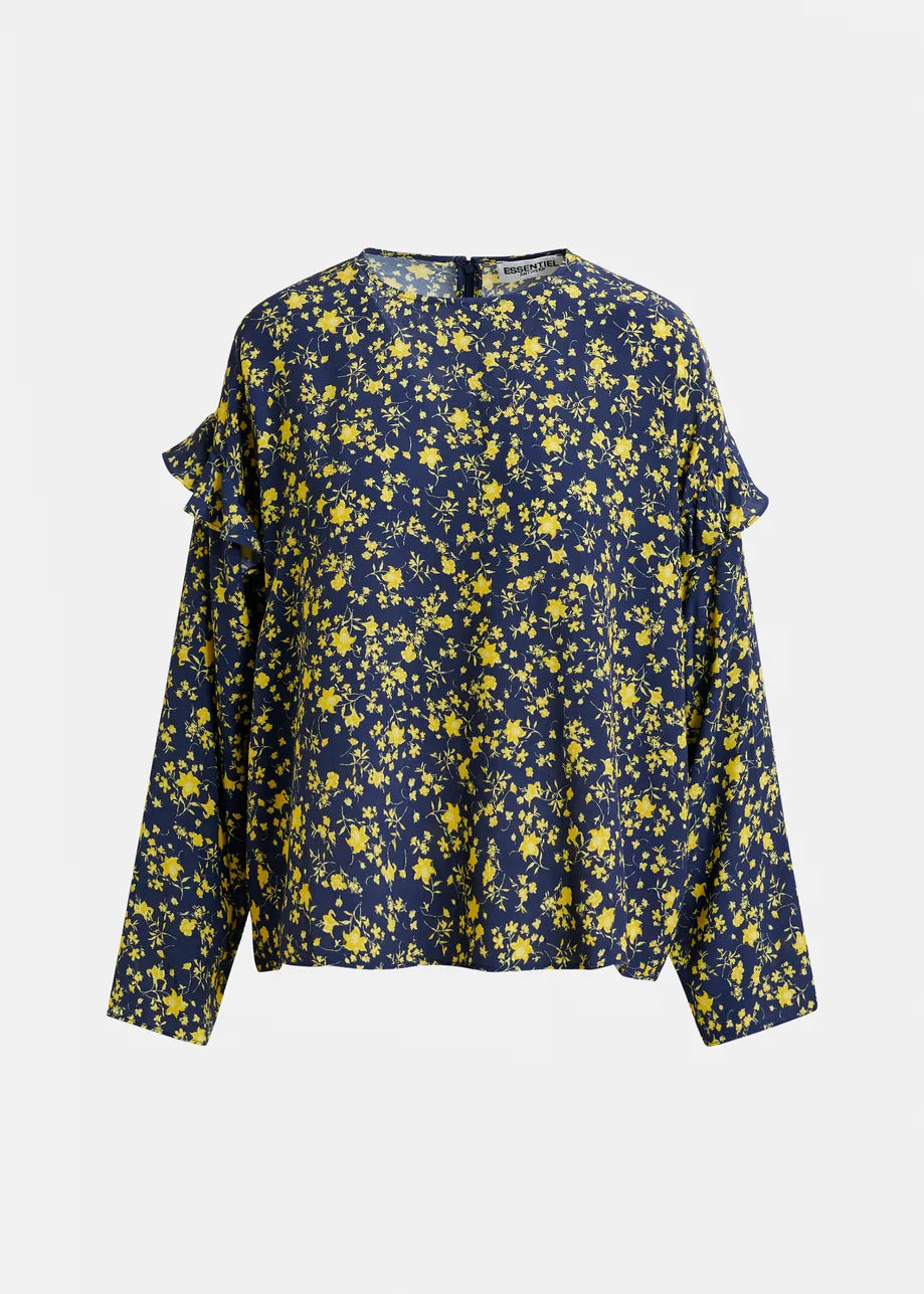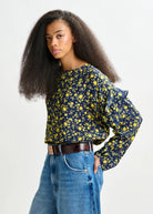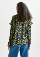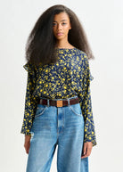 ESSENTIEL ANTWERP Navy and yellow floral print top with ruffle detail