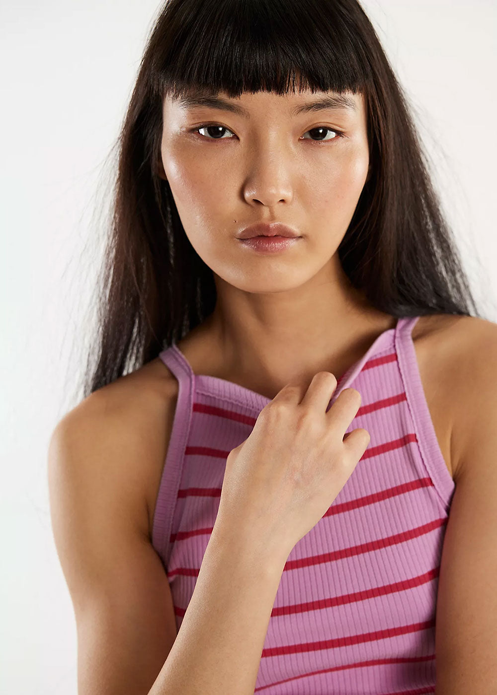 Features: High square neckline, dropped armholes, soft ribbed fabrication, striped print