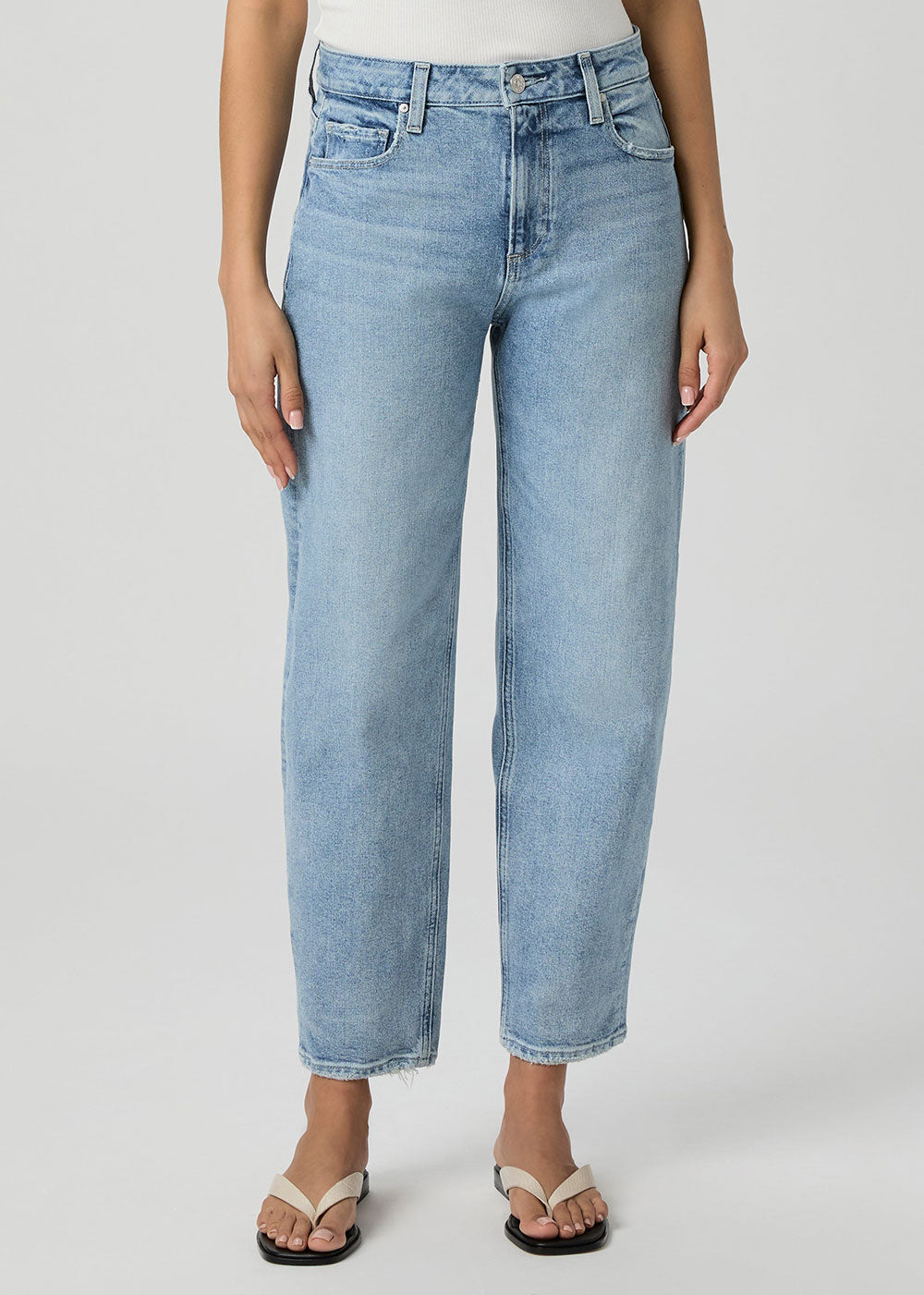 Alexis is our feminine take on the barrel leg while still creating a flattering fit. This high-rise silhouette is crafted from PAIGE VINTAGE denim in a lived-in light blue wash with true vintage character. PAIGE VINTAGE takes all of the work out of breaking in your favorite pair of vintage denim jeans. We've combined the comfort of stretch with everything you love about rigid vintage denim to create super soft jeans that feel perfectly lived-in from the very first wear.