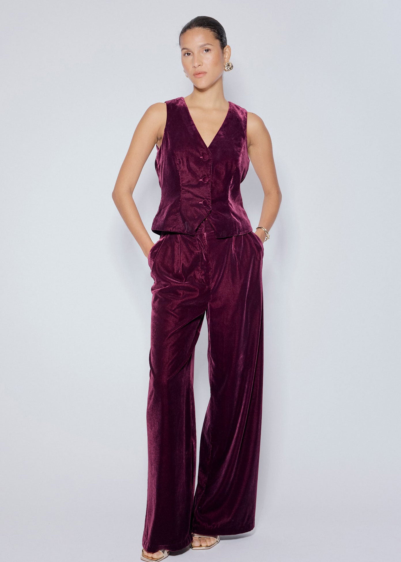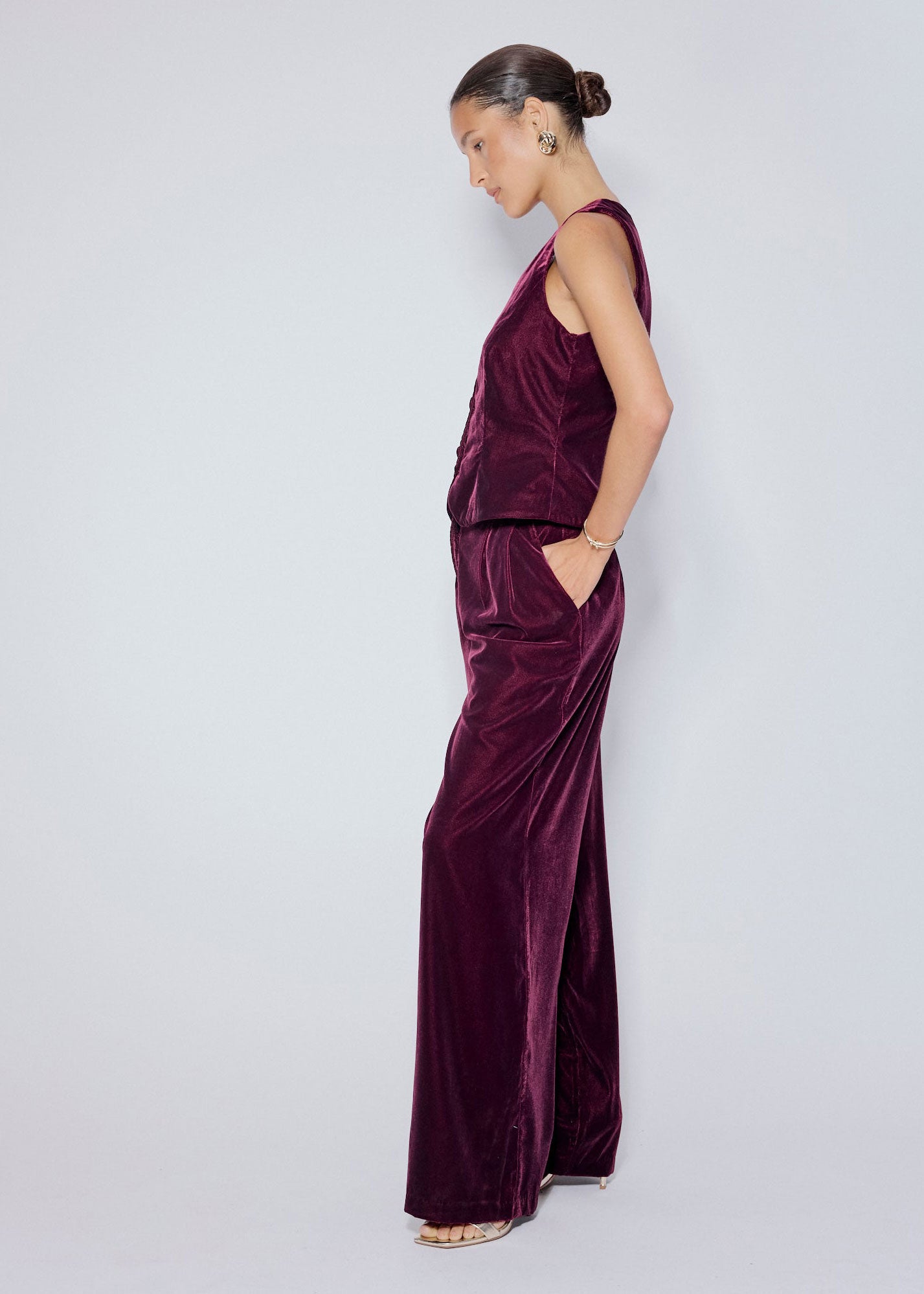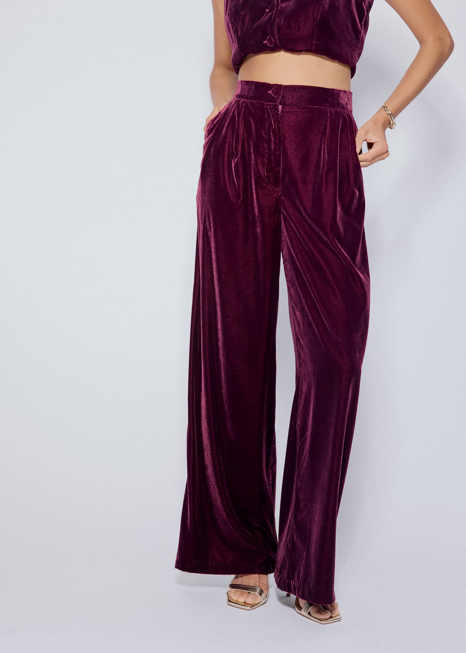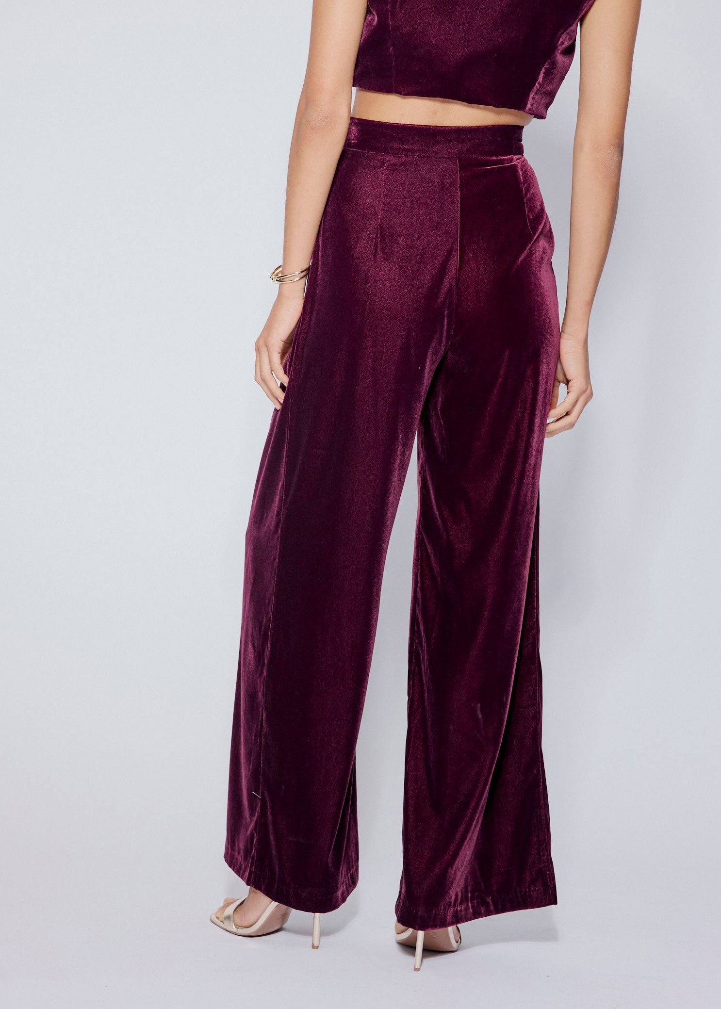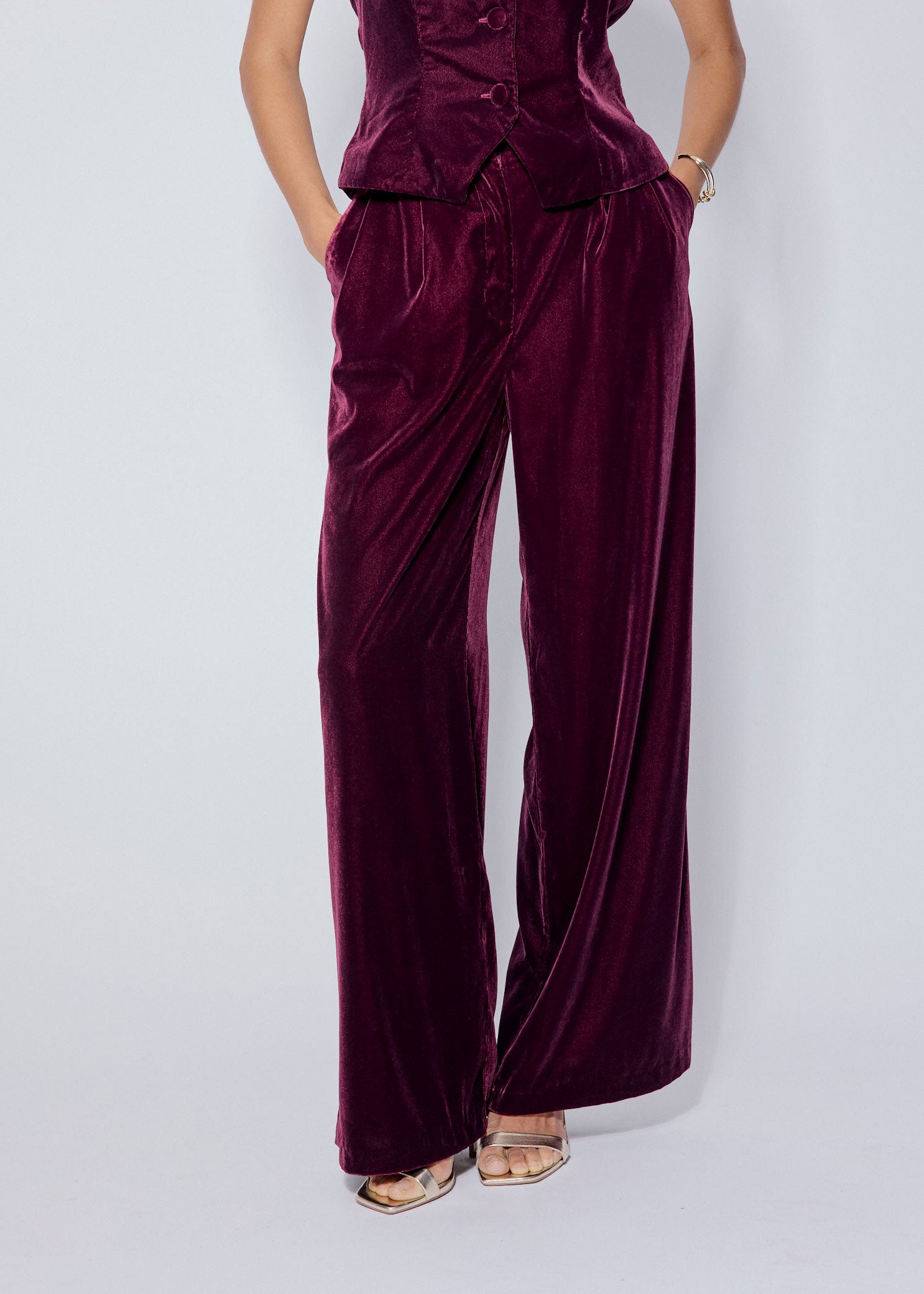 Designed in burgundy, these soft velvet trousers sit high on the waist with front pleats that fall to a wide leg. Style with the matching waistcoat.