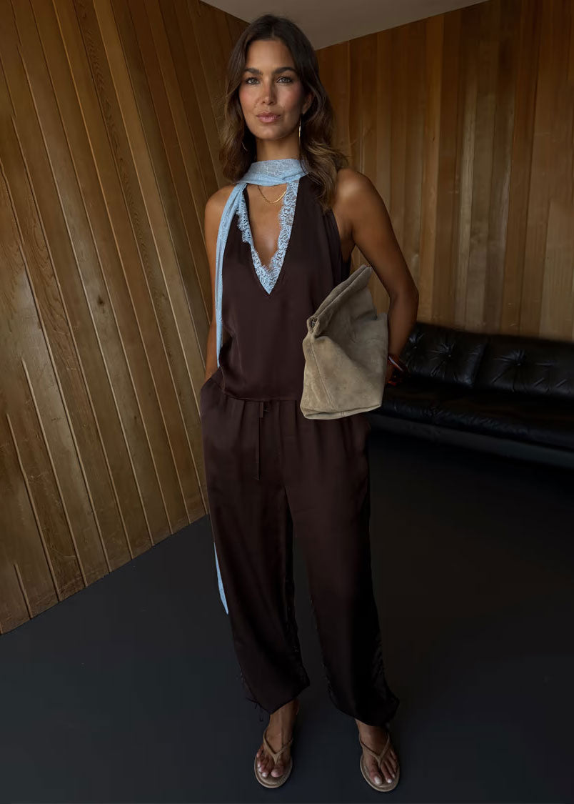 A soft satin viscose in a deep chocolate brown that works throughout the seasons! The chic balloon shape adds a unique element of structure, with an elasticated waistband for comfortability, side pockets and adjustable ties on the legs that allow you to style in a multitude of ways! Whether you're pairing with a tank or dressing them up with the matching lace top for a night out with the girls they're guaranteed to make a statement!