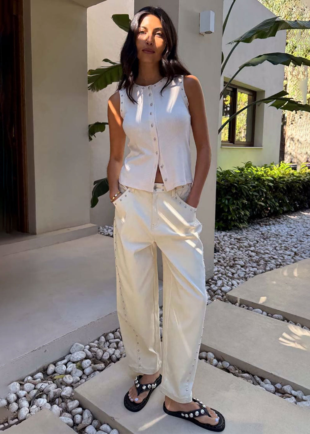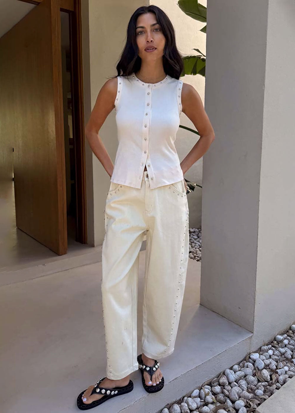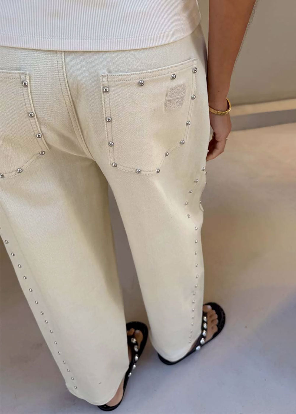 NEVER FULLY DRESSED Ecru Studded Barrel Jeans