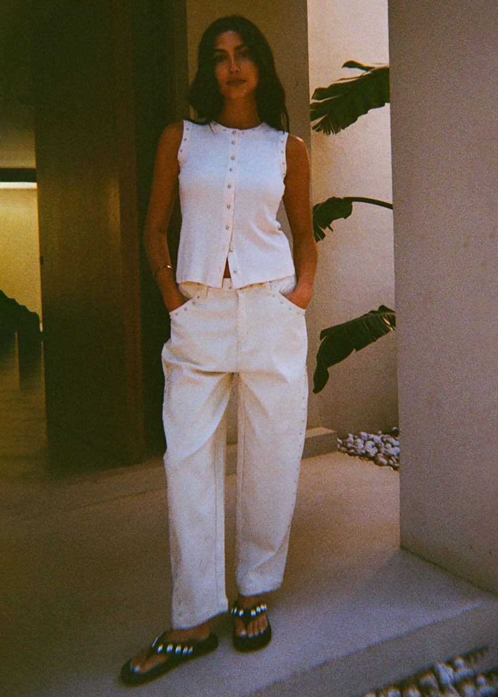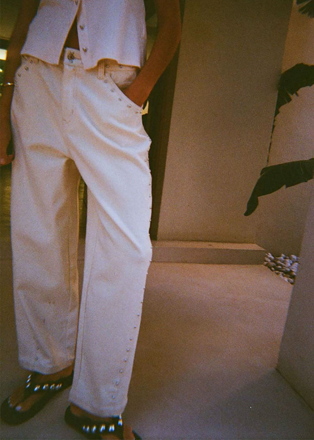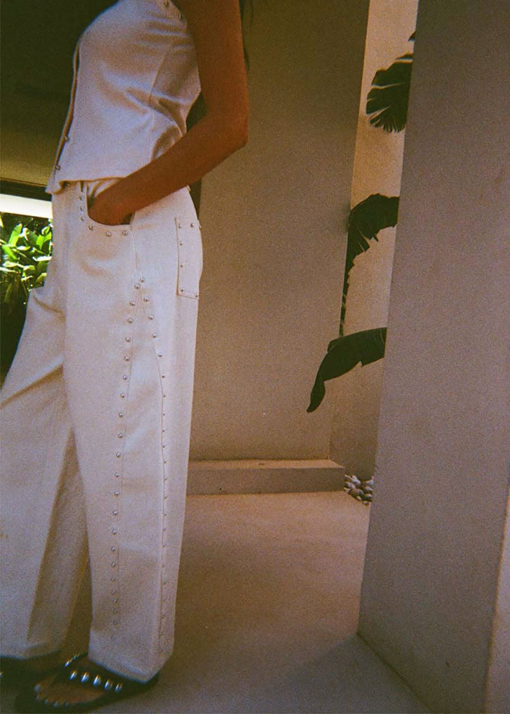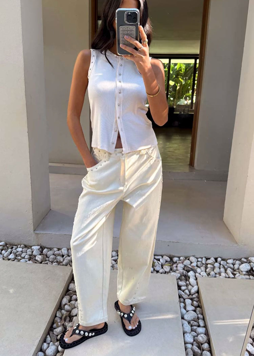 NEVER FULLY DRESSED Ecru Studded Barrel Jeans