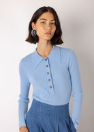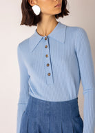 The CERISE polo in sky-light merino rib feels soft and breathable against the skin. Its refined polo collar and ribbed detail bring effortless polish—perfect for styling with tailored shorts or layered beneath a blazer for smart-casual ease.