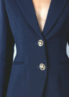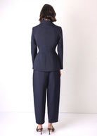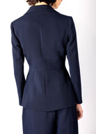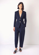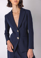 The SIDNEY blazer, in rich navy, is made from a virgin wool blend for a luxe, structured feel. Sculpted shoulders and fitted waist bring sharp elegance to your outfit—style it with the matching GRETA trouser for a crisp, contemporary suit moment.