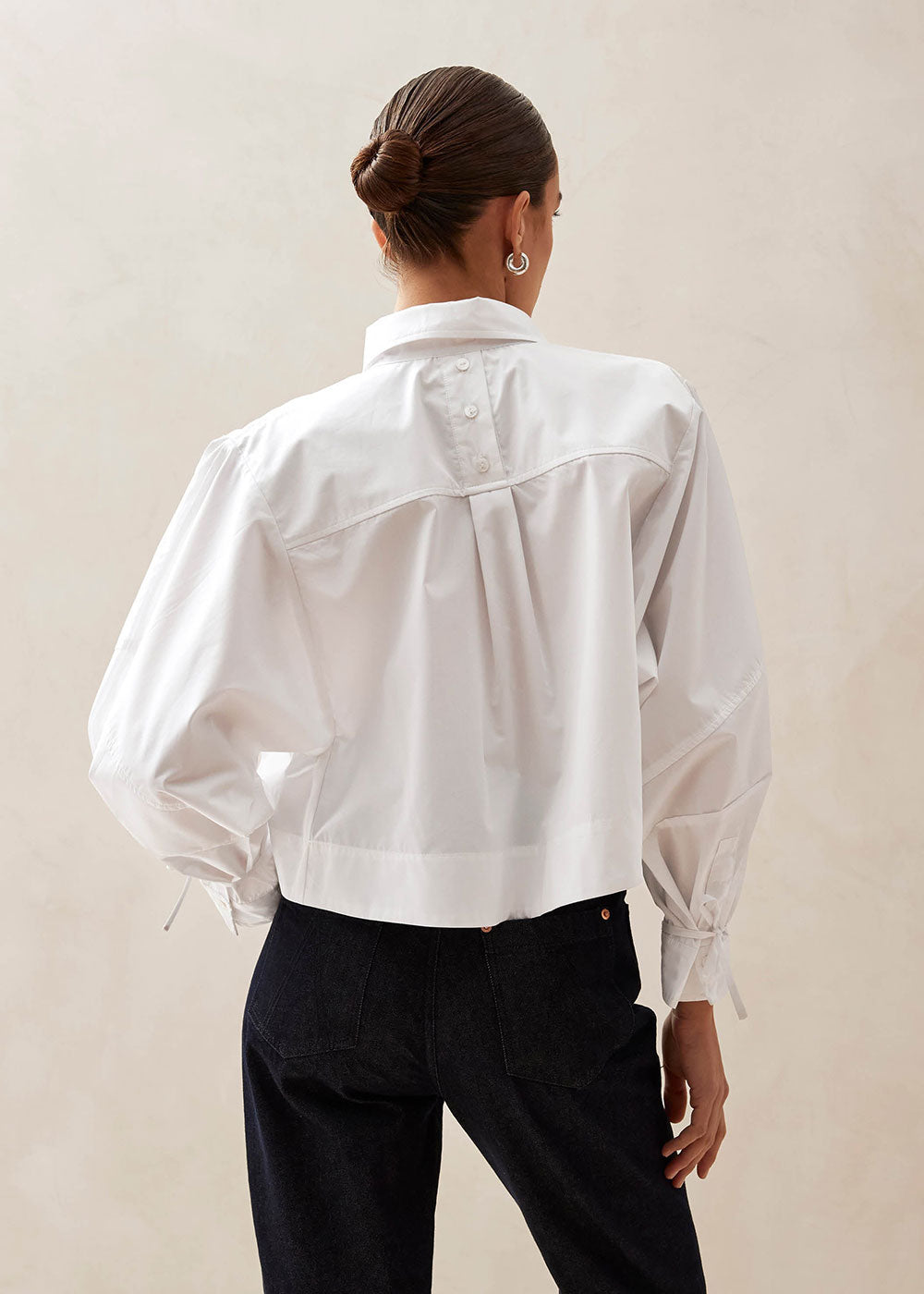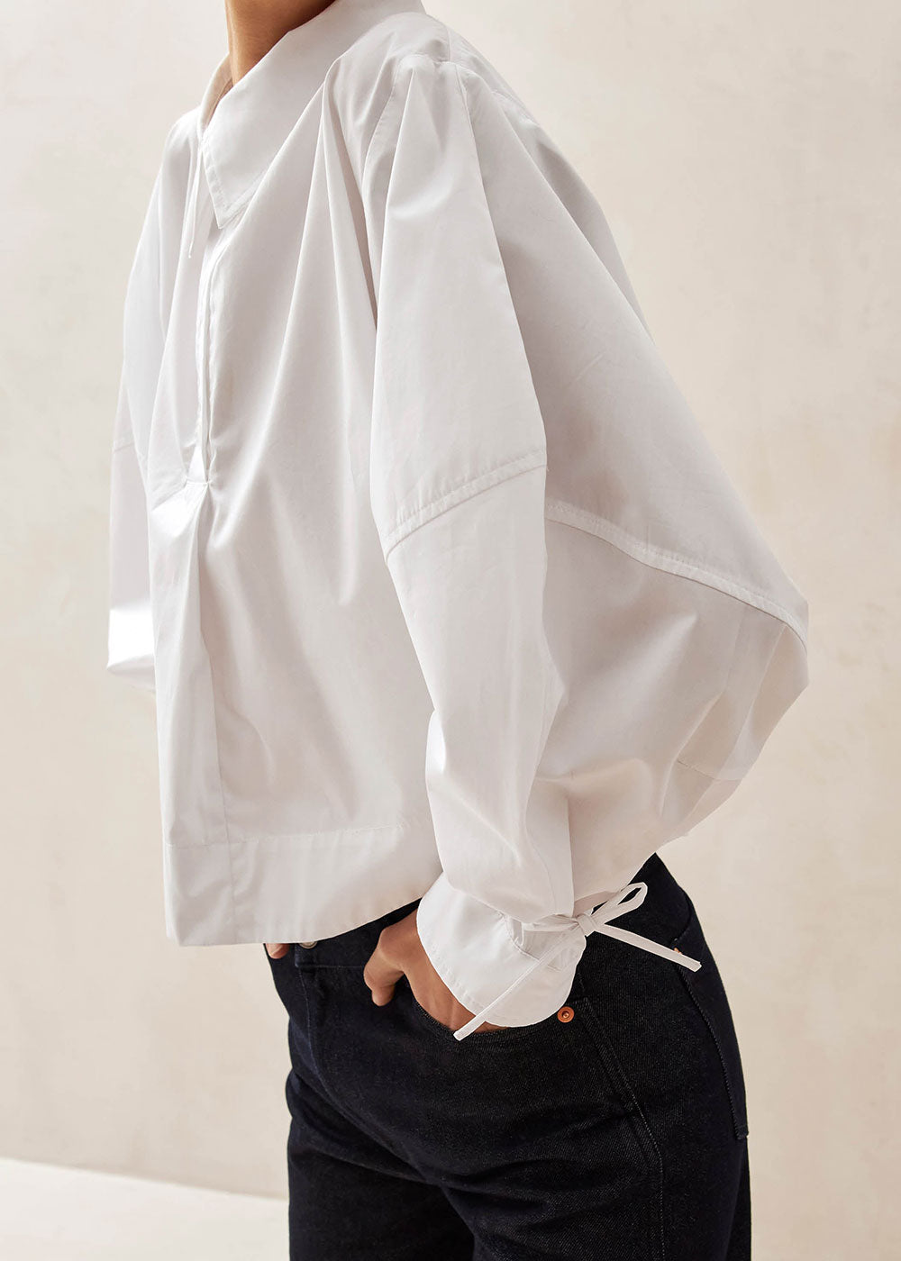 Introducing Adara, the perfect white boxy shirt to elevate your everyday office looks. Crafted from 100% cotton, it features a partial button-up front, decorative buttons in the back, wide sleeves with snug cuffs, and a floaty, flawless cut.