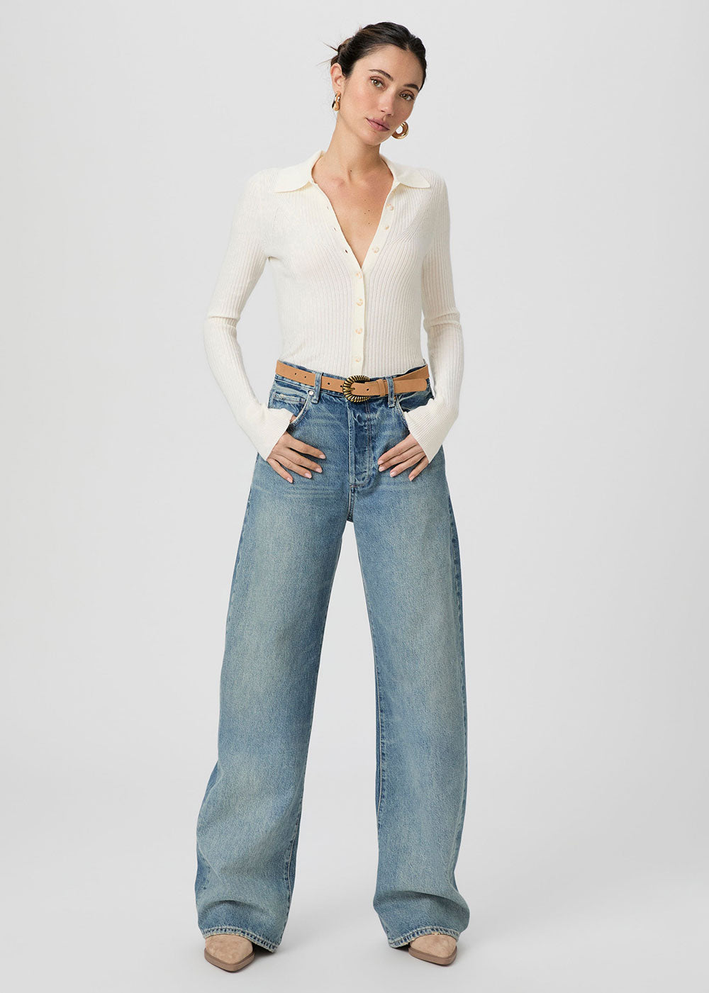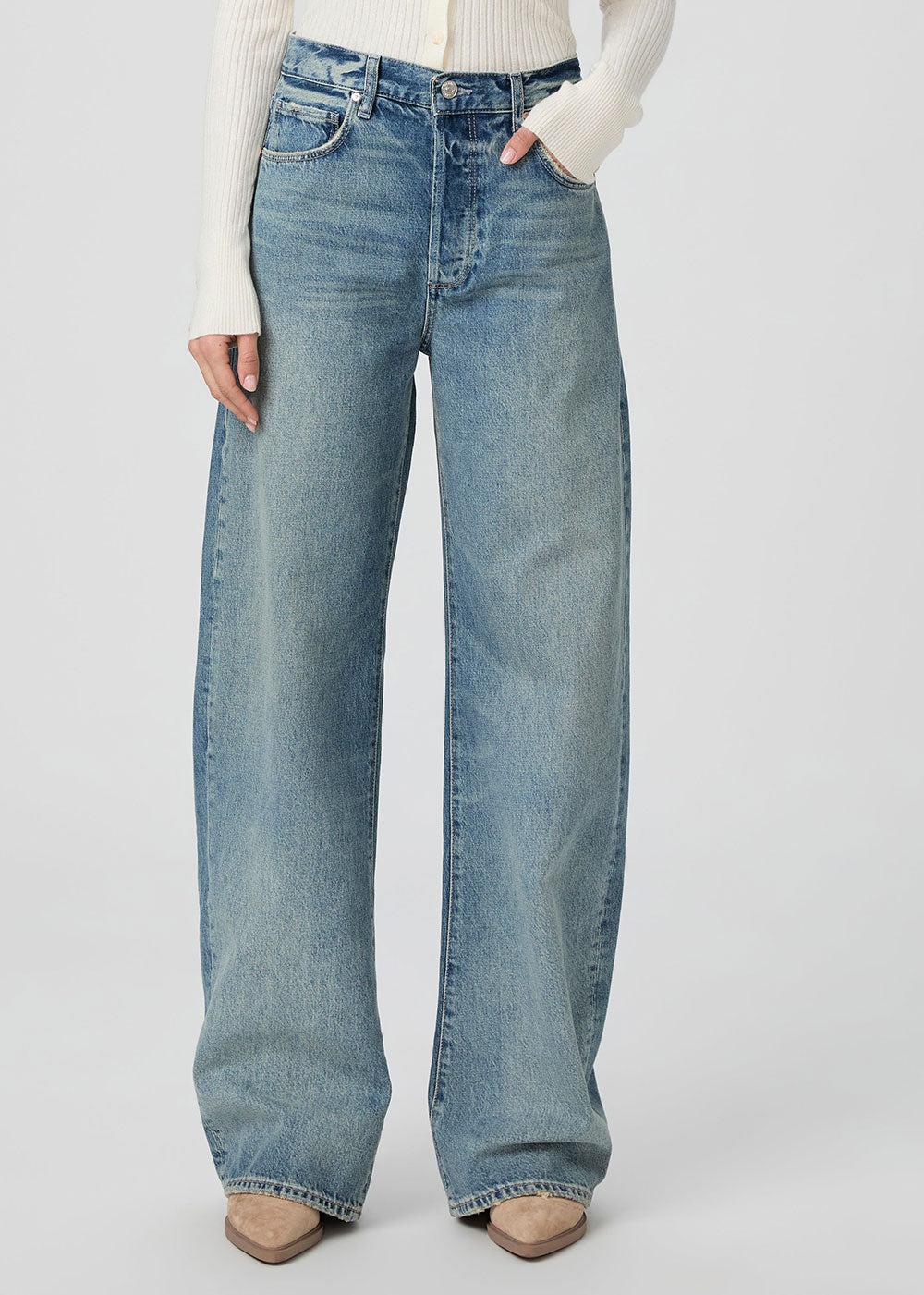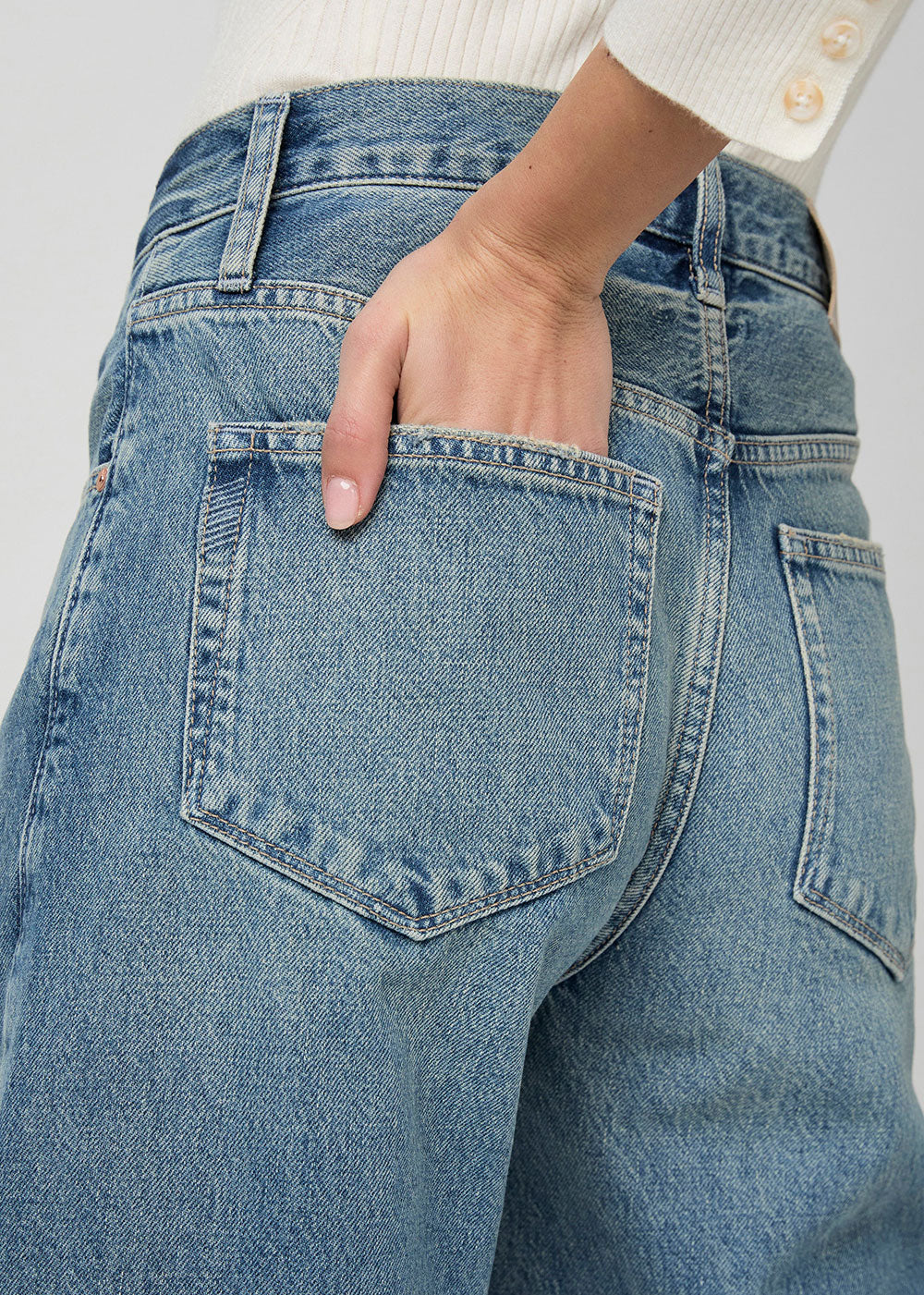Meet Arellia, our new long and lean barrel leg. This elevated style is cut from our new Heritage Rigid denim in a light vintage-inspired wash with natural fading, a covered buttonfly, and a 32" inseam. This new denim fabrication has more texture and marbling in the wash that gives it a cool, authentic lived-in look just like your favorite pair of rigid (yet comfortable) vintage jeans that you've had in your closet forever.